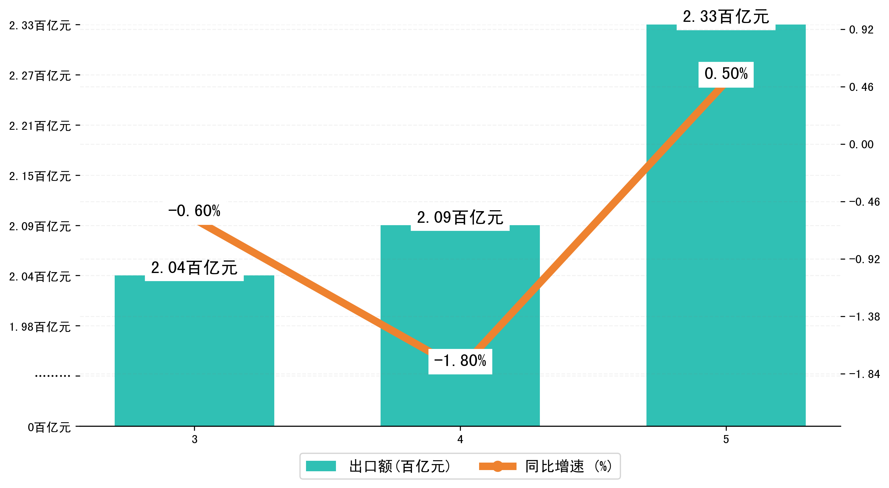 以人民币计,2024年1-5月常州市出口额为1026,9425.1207万元,相比上年同期增加了5,4745.6512万元,同比增加了0.50%。