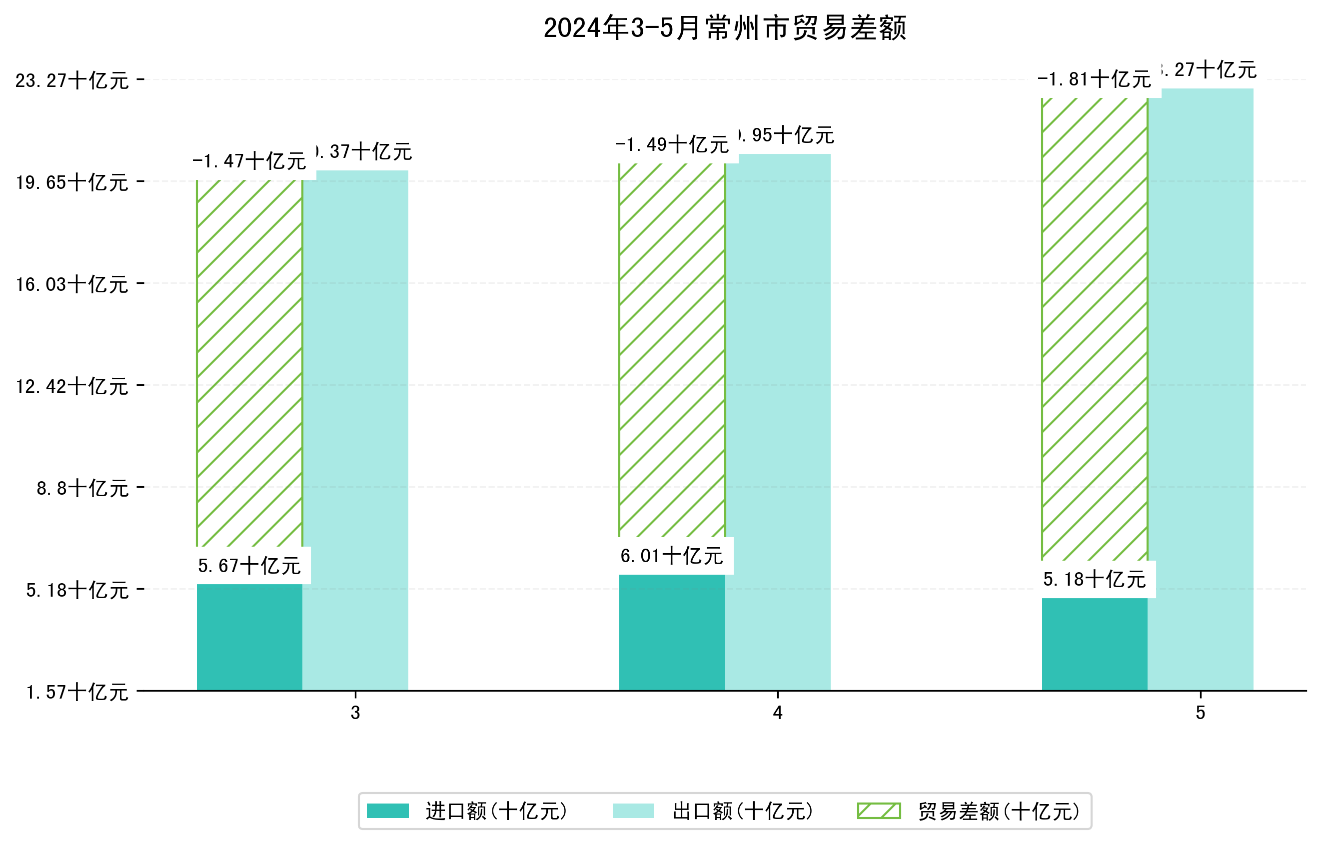 以人民币计,2024年5月常州市贸易差额为180,8298,3900万元(贸易顺差),相比上月增加了31,4729,0676万元,即4,4364,5749万美元;相比上年同期增加了32,3992,2799万元,同比增加21.83%。