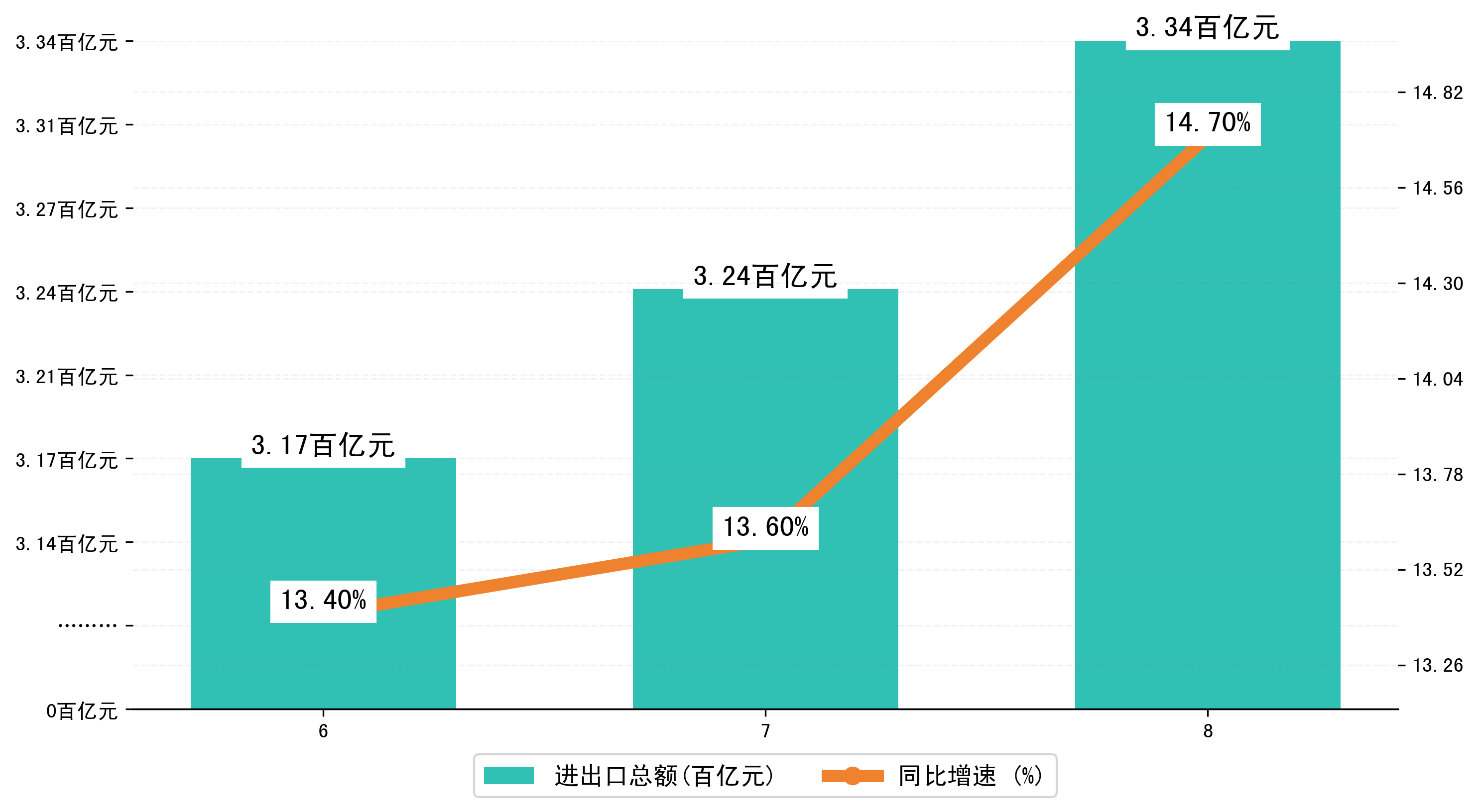 以美元计,2025年1-8月常州市进出口总额为341,0283.1369万美元,相比上年同期增加了40,3404.9639万美元,同比增加13.60%。