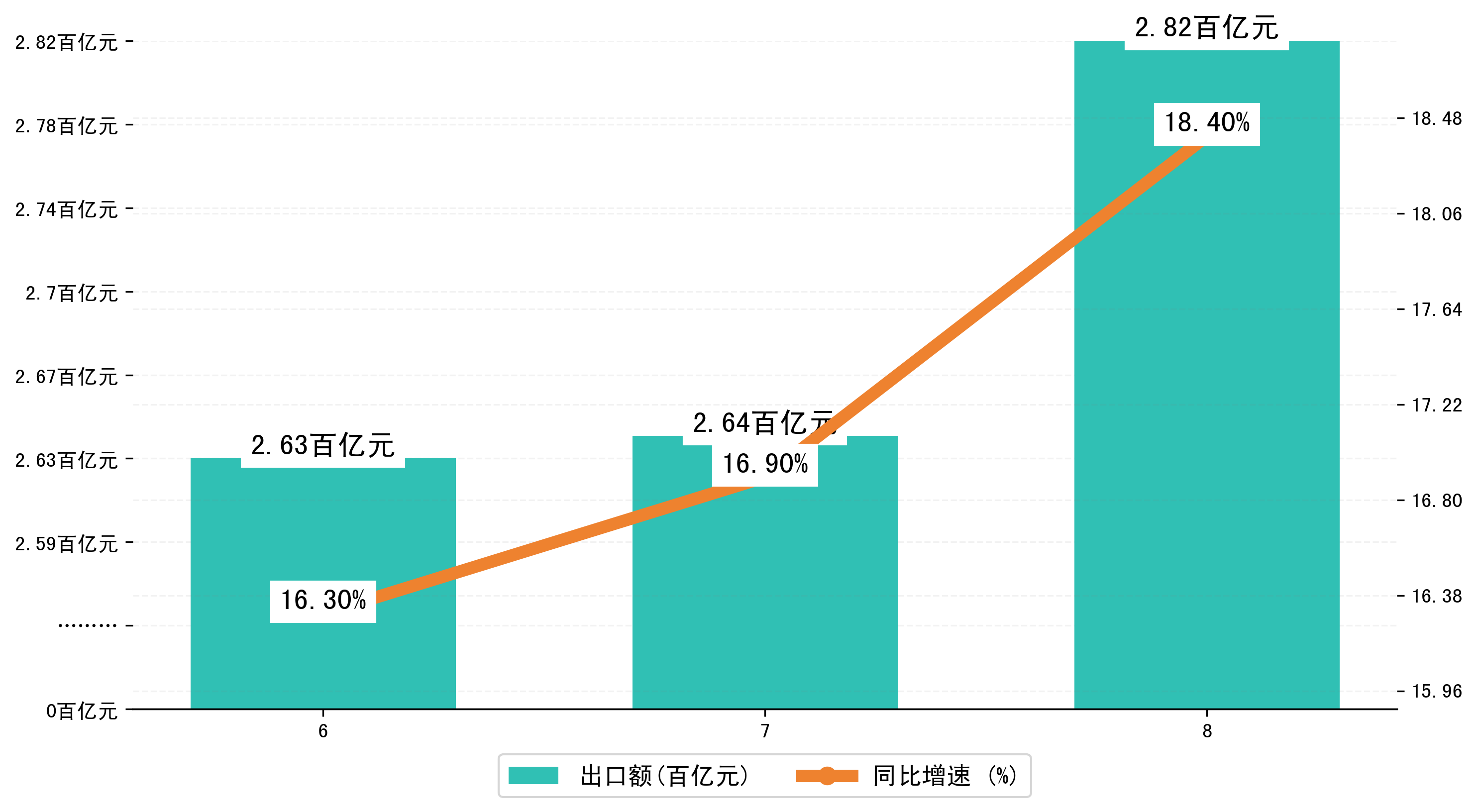 以美元计,2025年1-8月常州市出口额为278,8061.8403万美元,相比上年同期增加了40,9314.2406万美元,同比增加17.20%。