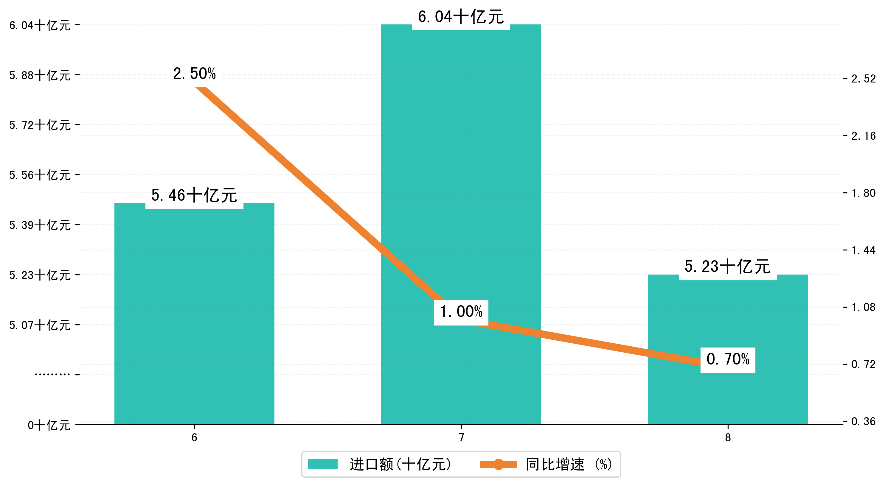 以人民币计,2025年1-8月常州市进口额为446,5406.5409万元,相比上年同期增加了246.2563万元,同比增加了0.70%。