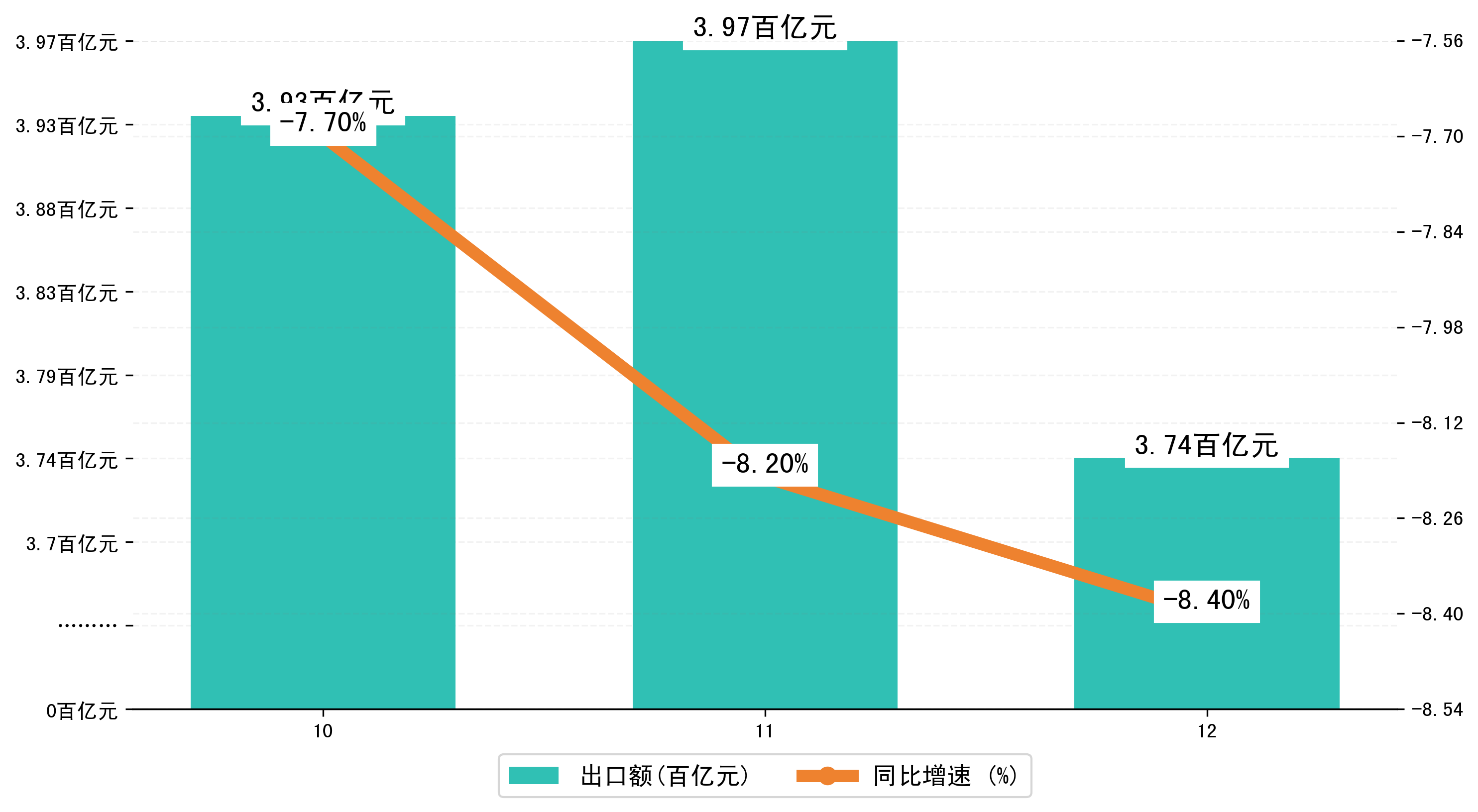 以美元计,2023年12月成都市出口额为52,1754.5344万美元,相比上月减少了3,1731.8315万美元;相比上年同期减少了6,9933.8086万美元,同比减少-13.10%。