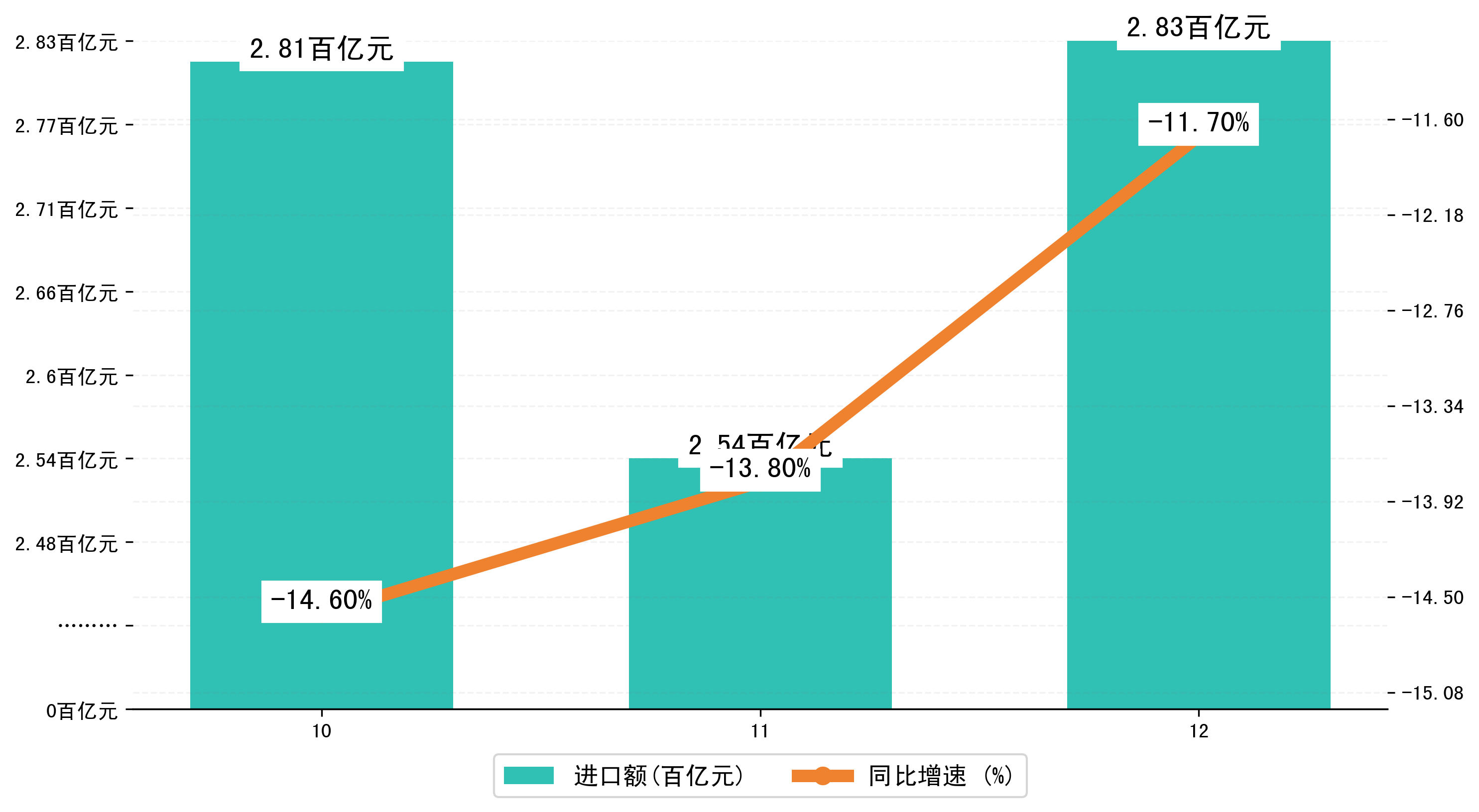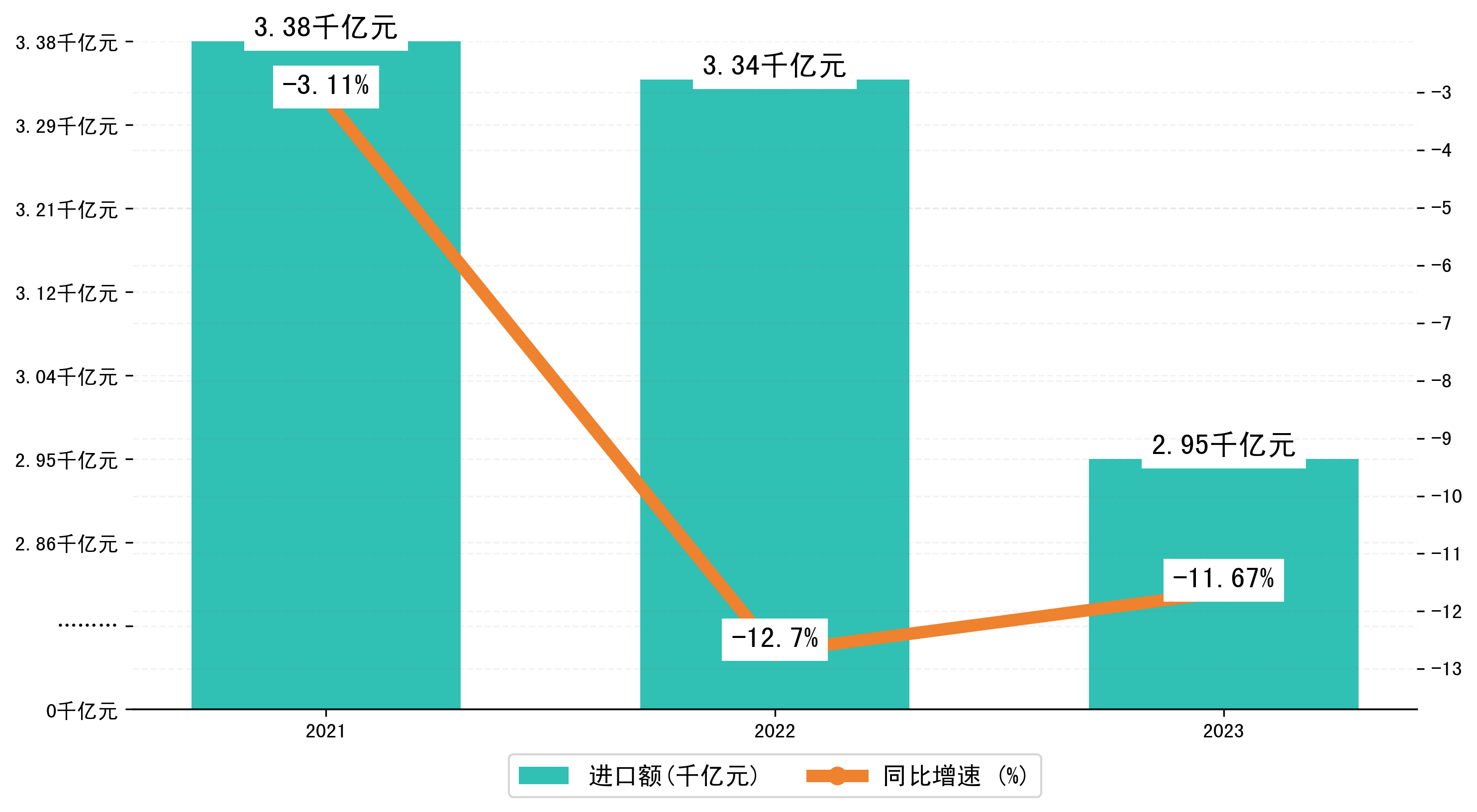 以人民币计,2023年1-12月成都市进口额为2950,8226.7396万元,相比上年同期减少了390,0328.6666万元,同比减少了-11.70%。