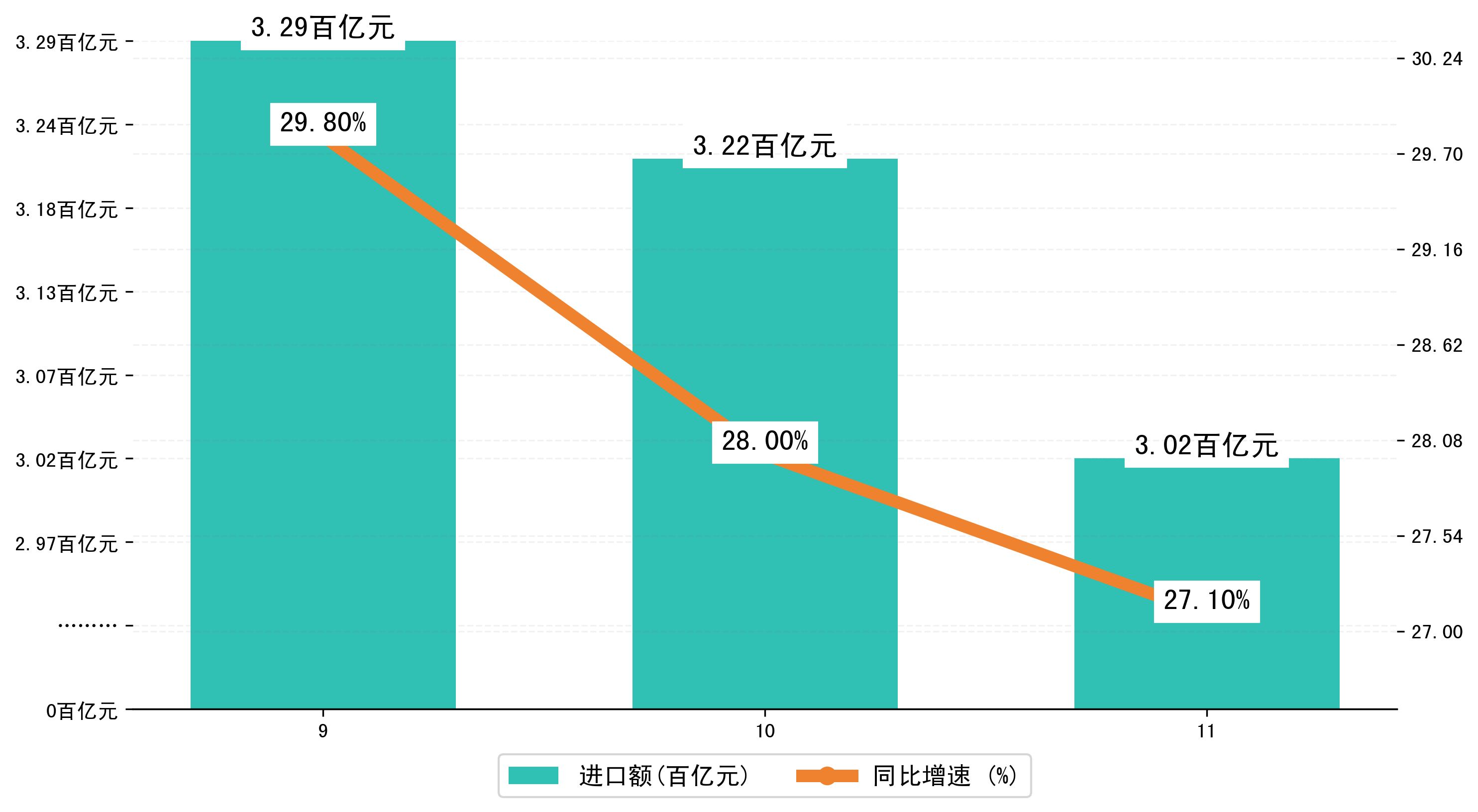 以人民币计,2024年11月成都市进口额为302,0432.3718万元,相比上月减少了19,5457.2301万元;相比上年同期增加了47,9212.5202万元,同比增加了27.10%。