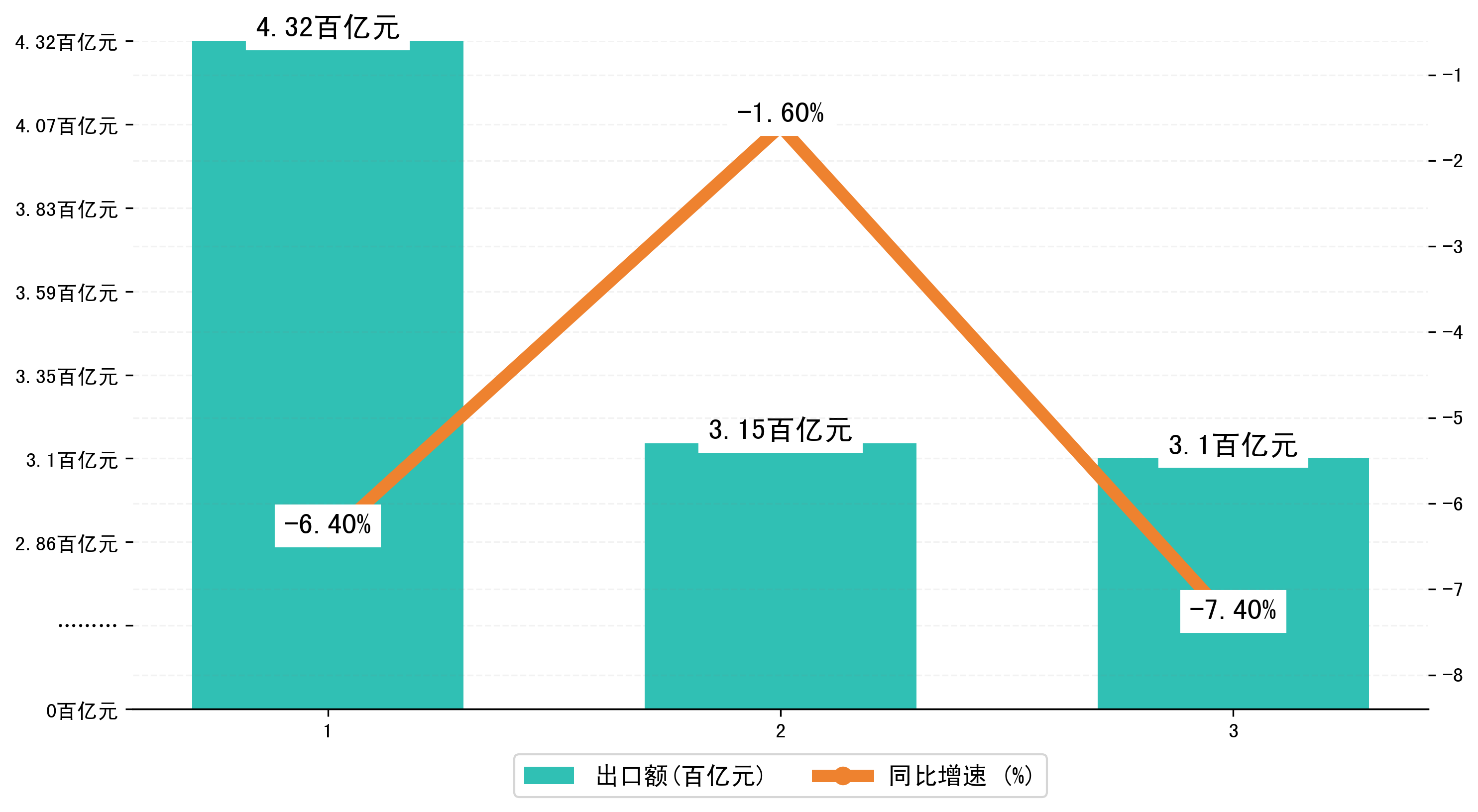 以美元计,2024年1-3月成都市出口额为148,7159.1419万美元,相比上年同期减少了21,9140.5752万美元,同比减少-10.40%。