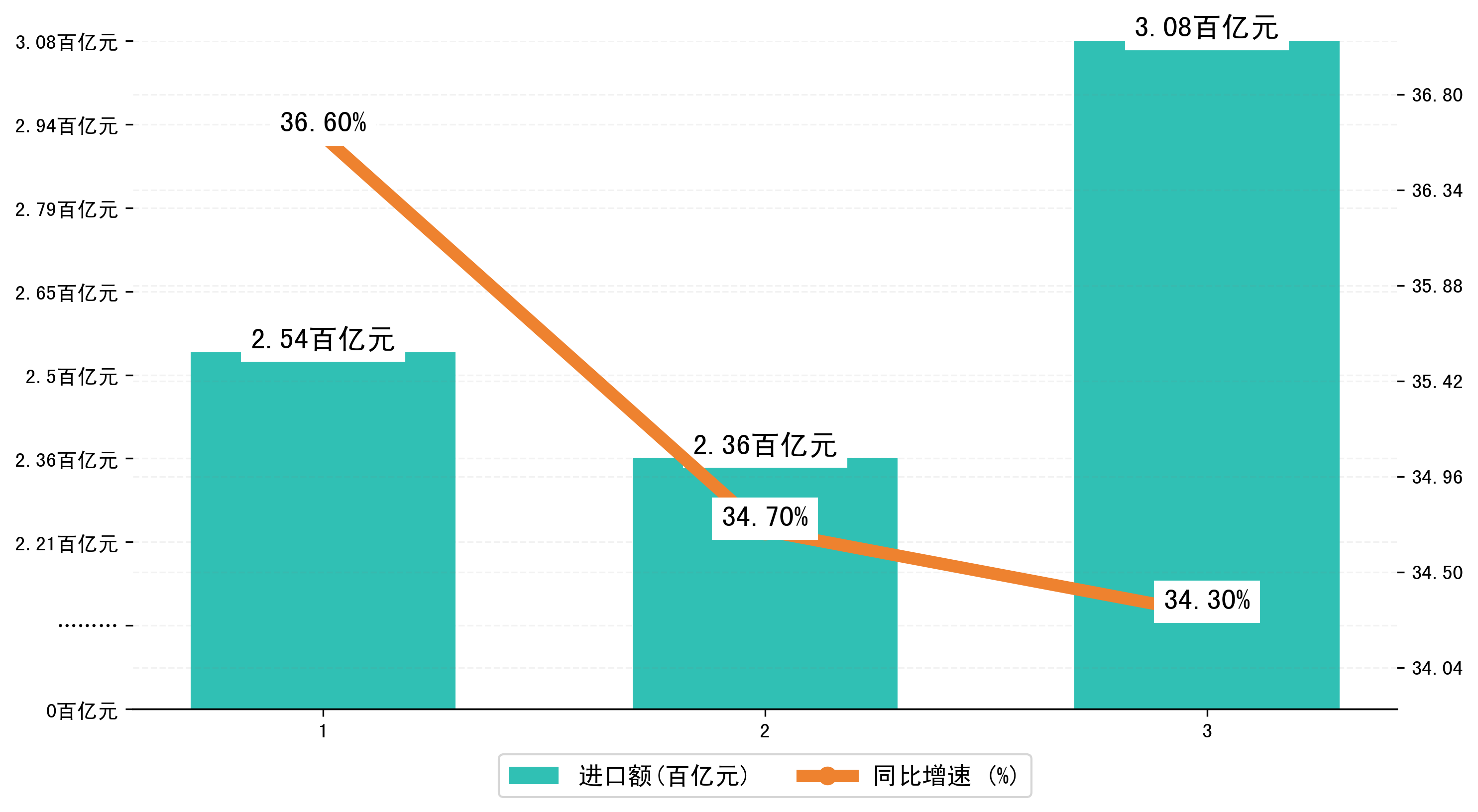 以人民币计,2024年3月成都市进口额为308,3566.208万元,相比上月增加了72,3805.2306万元;相比上年同期增加了77,6744.5329万元,同比增加了34.30%。