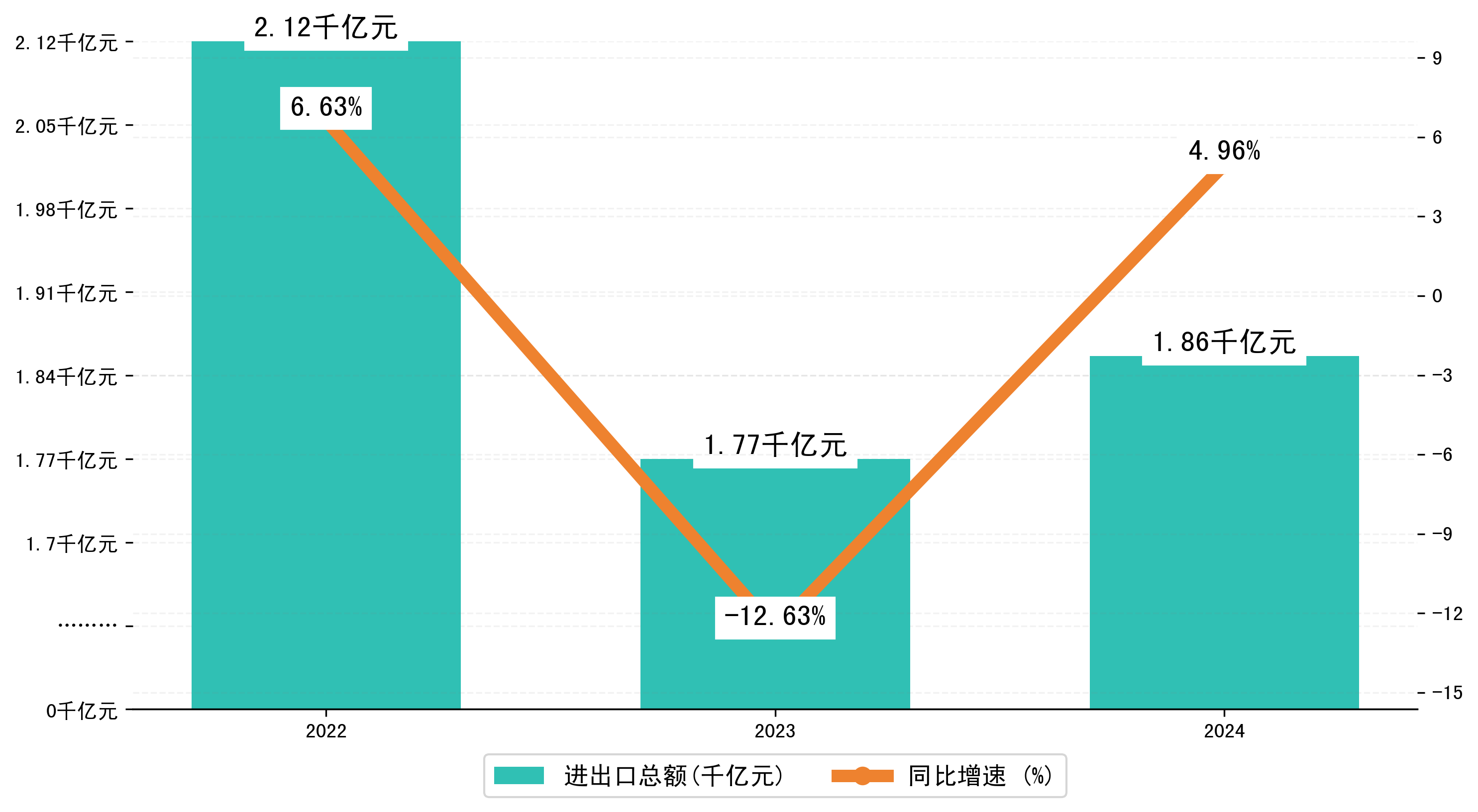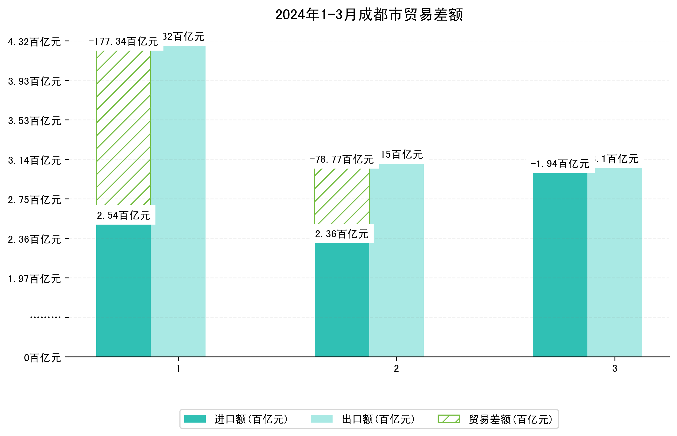 以美元计,2024年1-3月成都市进出口总额为261,1383.716万美元,相比上年同期增加了3,8681.2705万美元,同比增加3.30%。