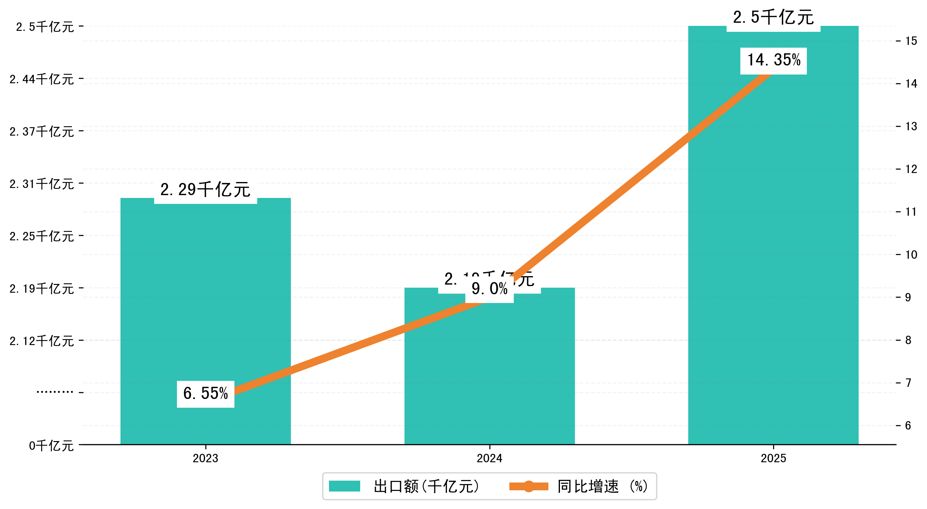 以人民币计,2025年1-6月成都市出口额为2499,8143.9087万元,相比上年同期增加了313,7073.0913万元,同比增加了14.50%。