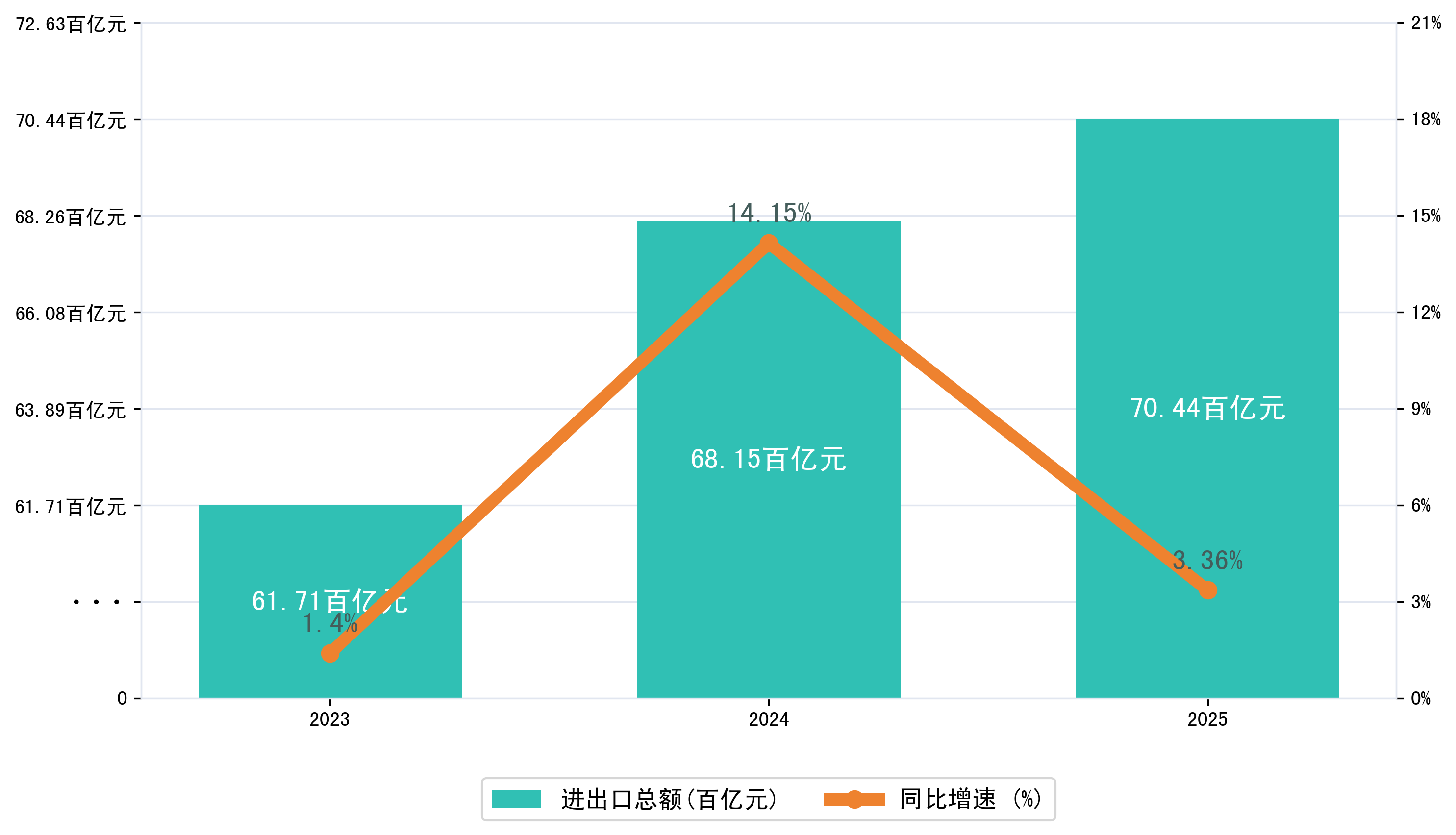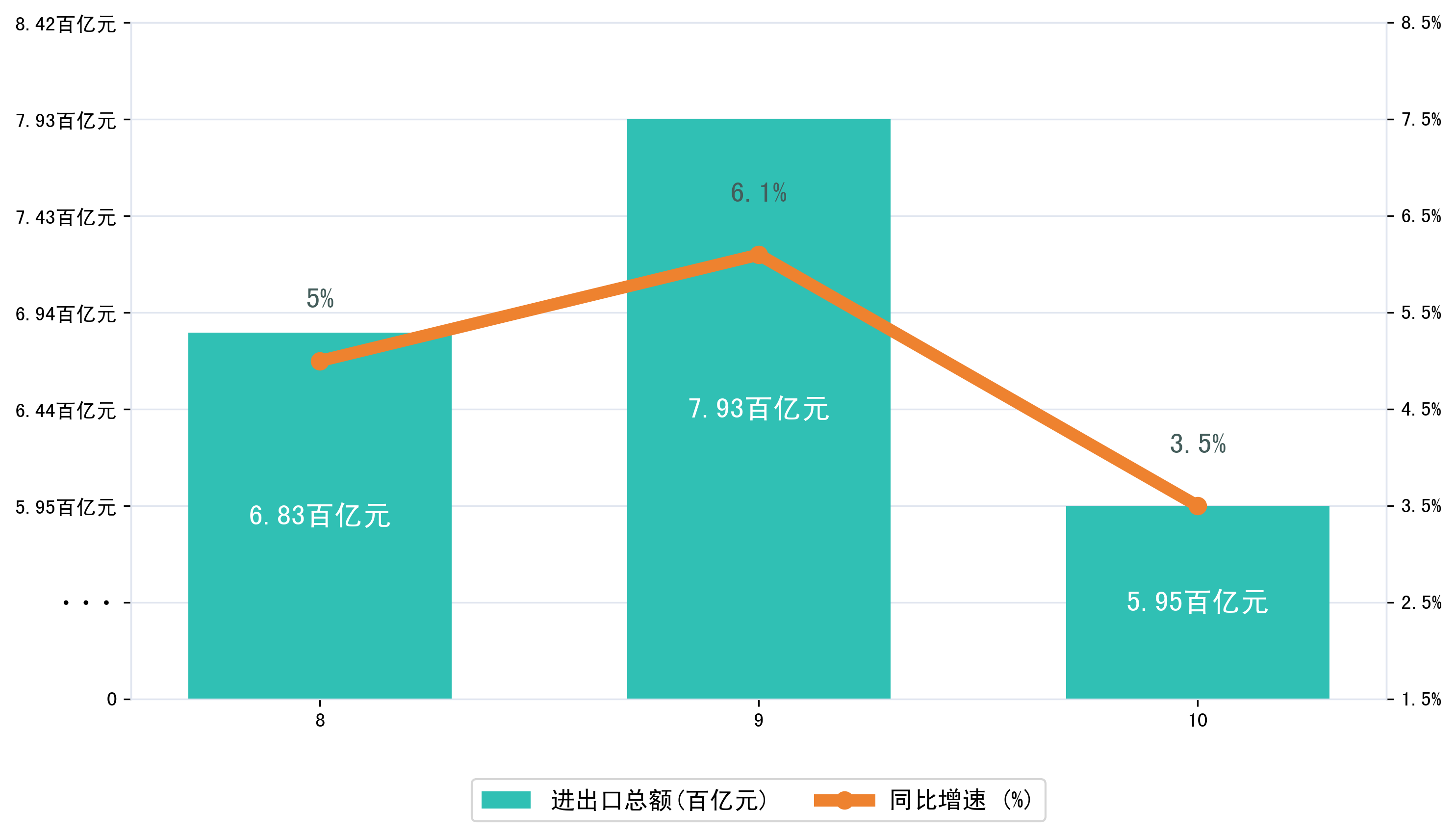 以人民币计,2025年1-10月成都市进出口总额为7044,4282.0629万元,相比上年同期增加了229,1606.9186万元,同比增加了3.50%。