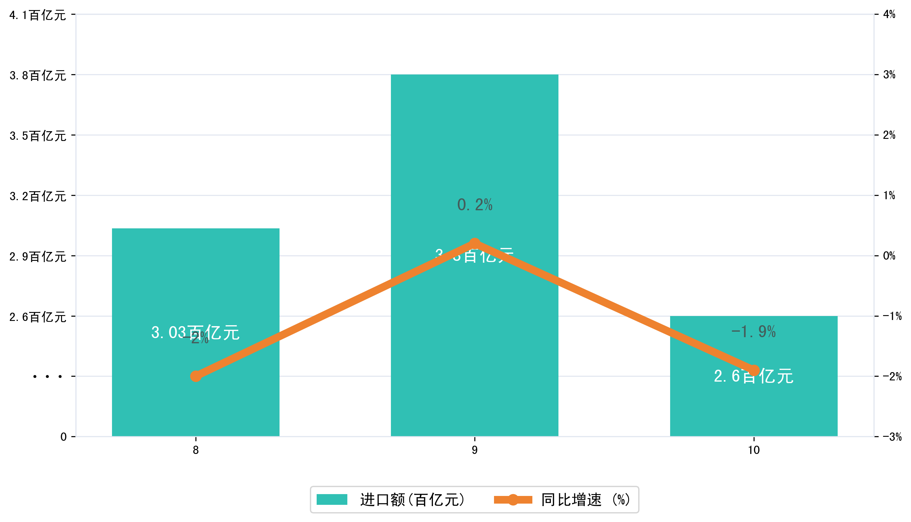 以美元计,2025年1-10月成都市进口额为421,0458.2433万美元,相比上年同期减少了13,7324.8638万美元,同比减少-2.70%。