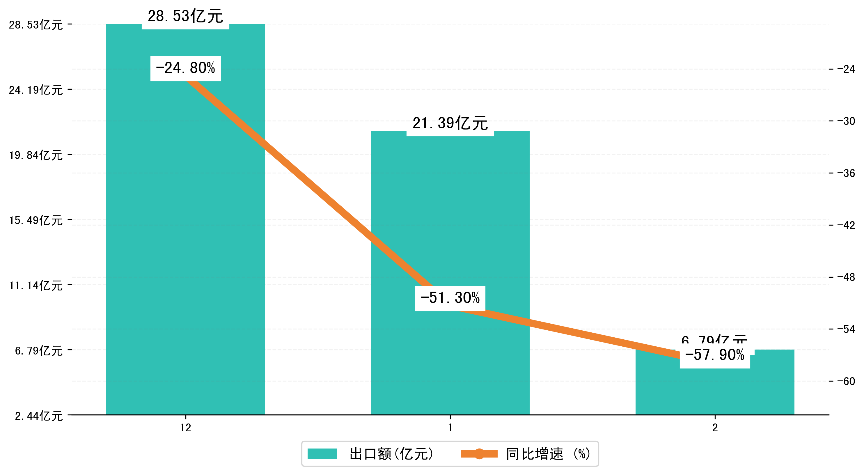 以人民币计,2024年1-2月郴州市出口额为28,1841.839万元,相比上年同期减少了42,5365.4041万元,同比减少了-57.90%。