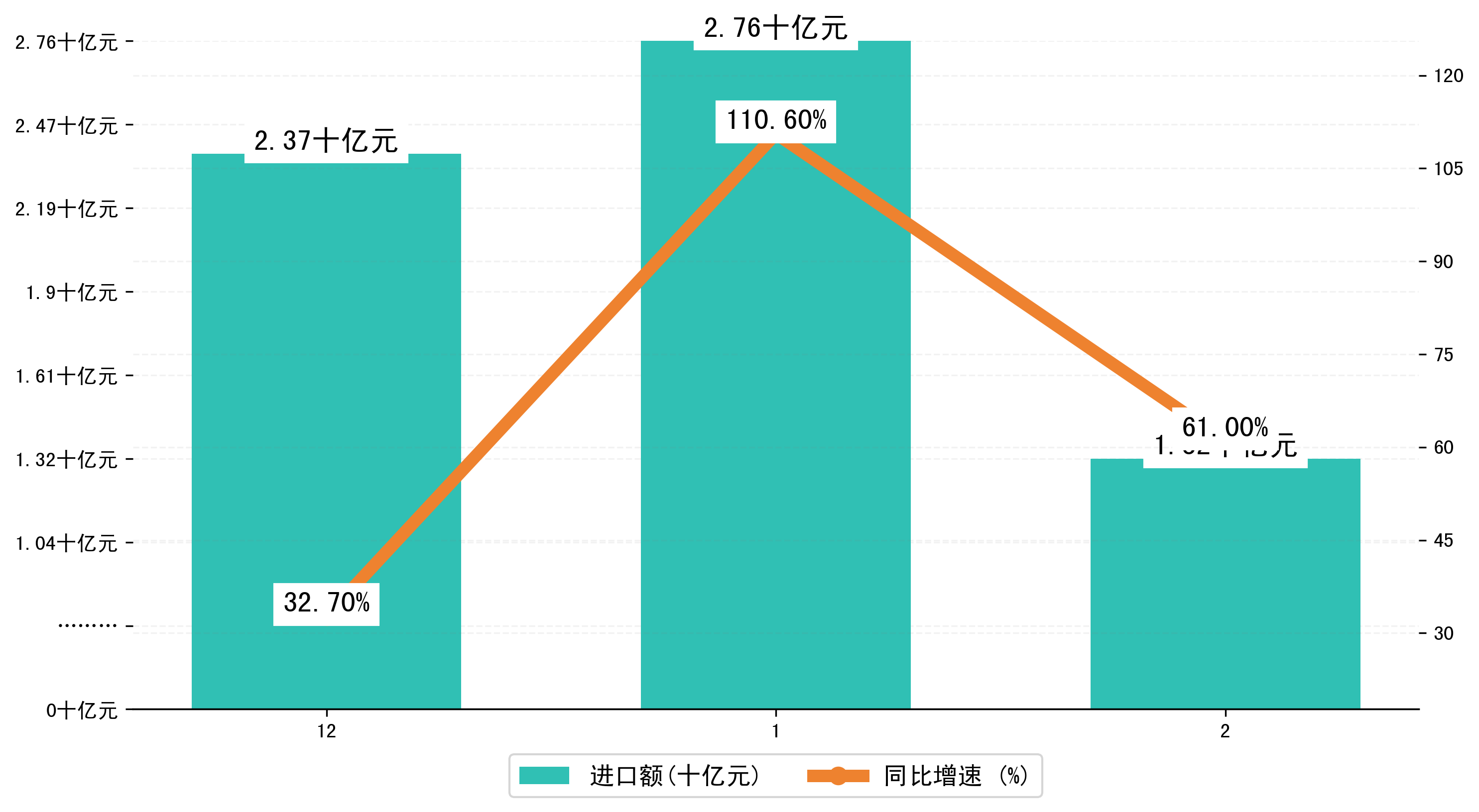 以美元计,2024年1-2月郴州市进口额为5,7515.5625万美元,相比上年同期增加了1,2006.4346万美元,同比增加56.00%。