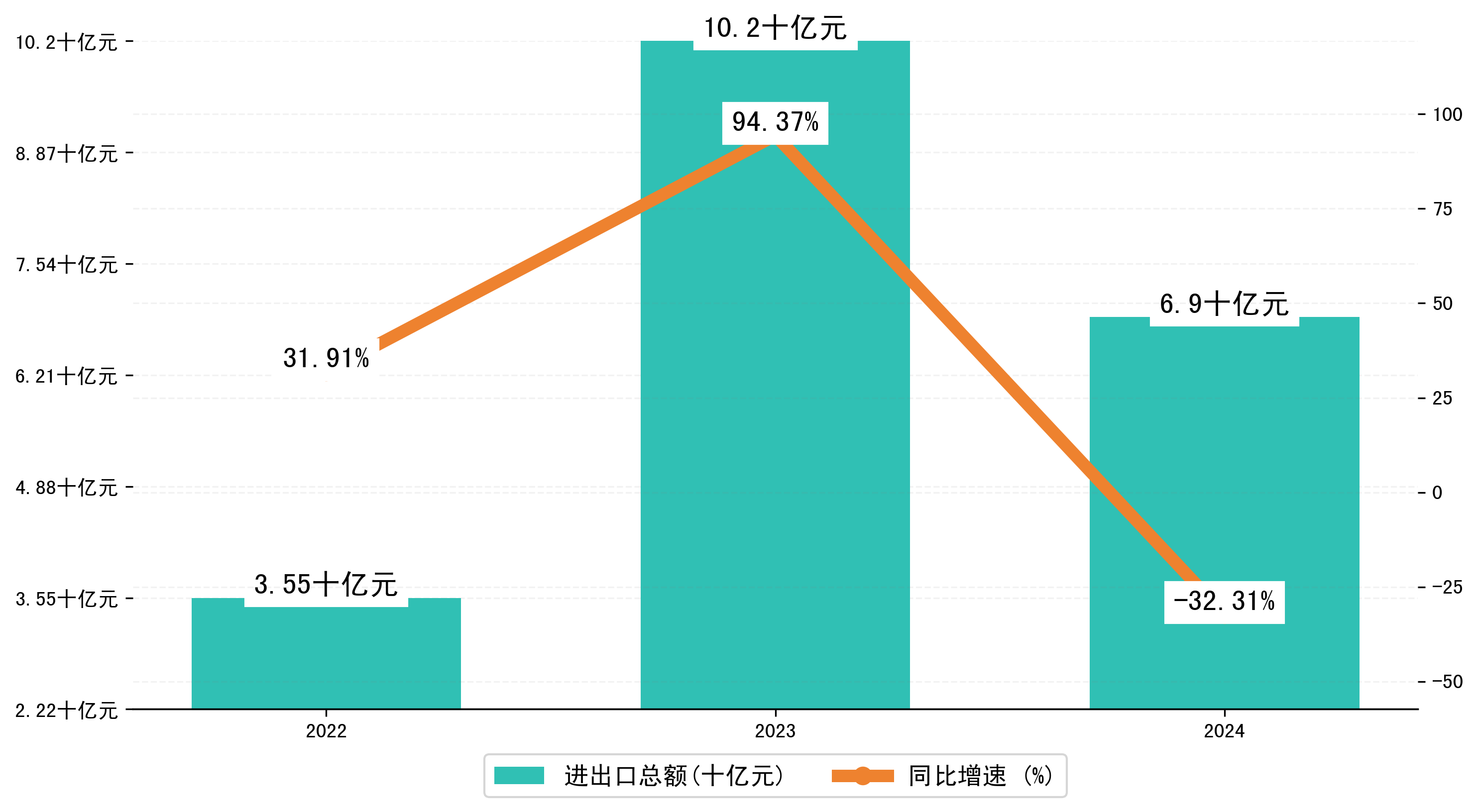 以人民币计,2024年1-2月郴州市进出口总额为69,0364.755万元,相比上年同期减少了32,9485.6222万元,同比减少了-25.30%。
