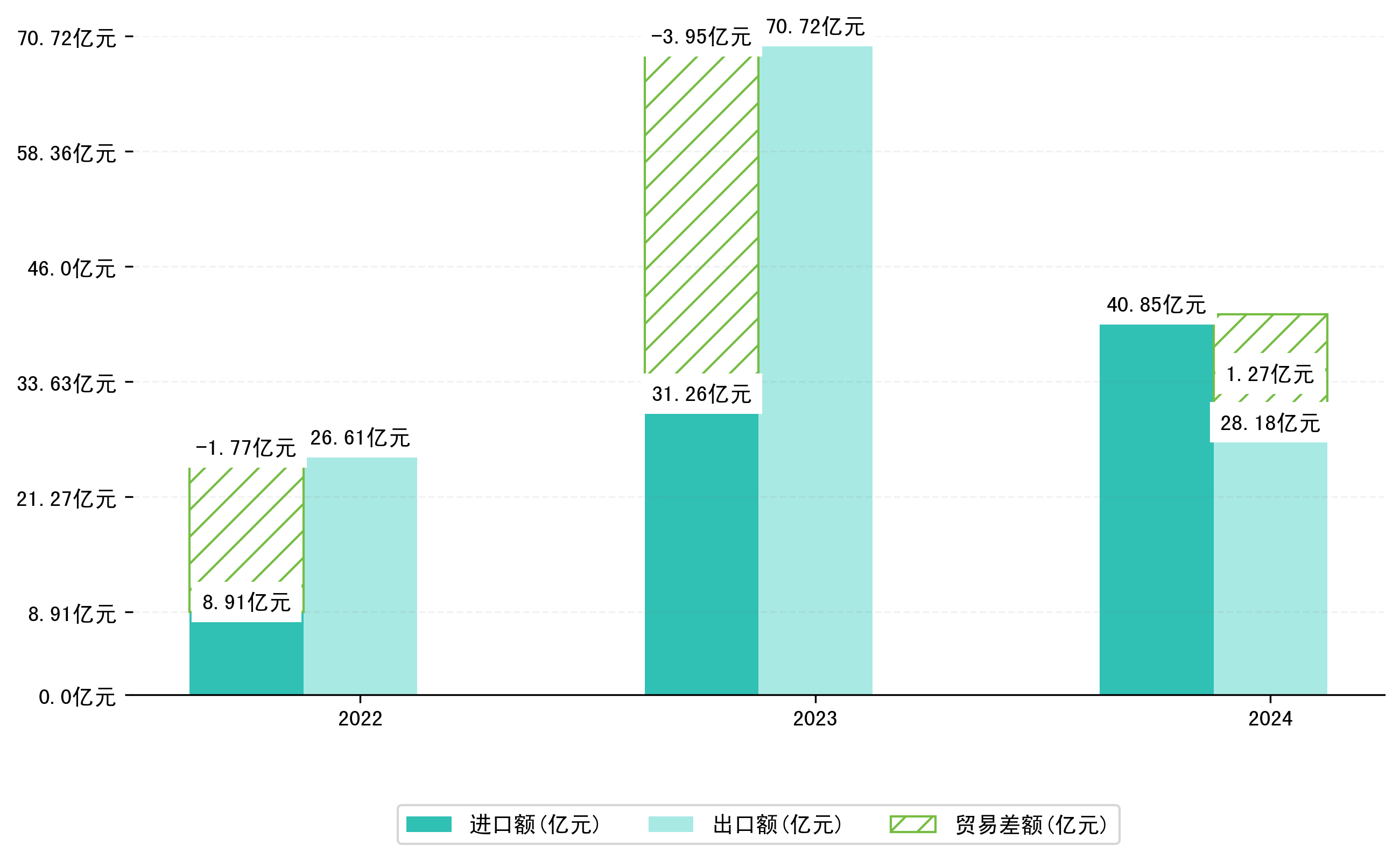 以人民币计,2024年1-2月郴州市贸易差额为12,6681,0770万元(贸易逆差),相比上年同期减少了52,1245,1860万元,同比减少-132.11%。