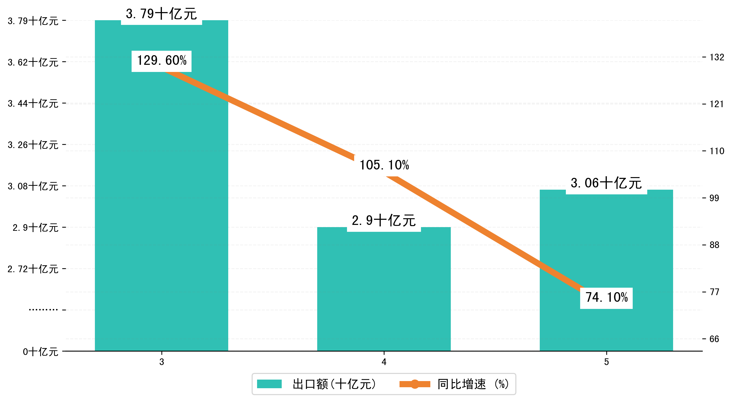 以人民币计,2023年5月郴州市出口额为30,6255.4049万元,相比上月增加了1,6150.2369万元;相比上年同期减少了19,4966.7376万元,同比增加了74.10%。