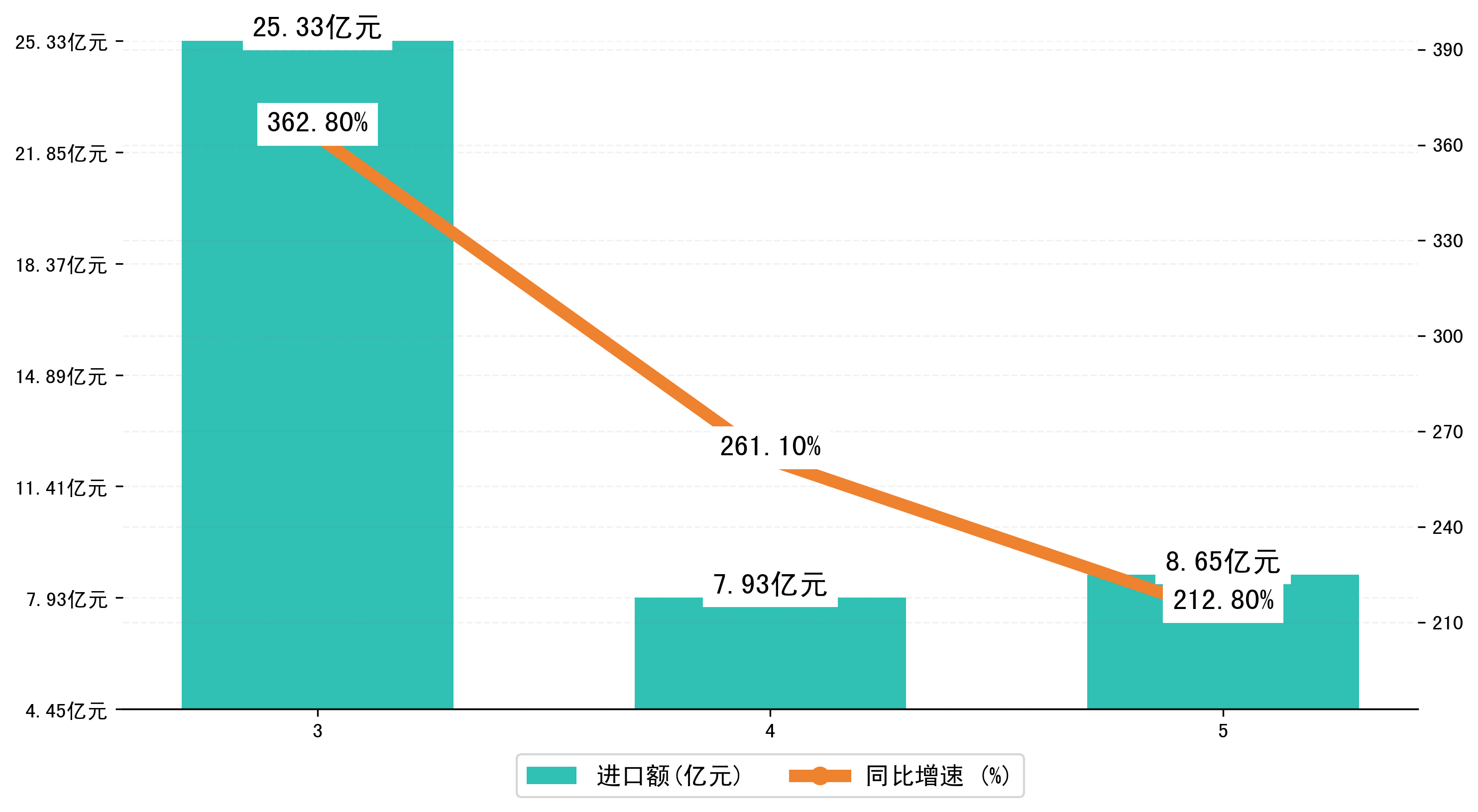 以人民币计,2023年5月郴州市进口额为8,6522.4878万元,相比上月增加了7242.9453万元;相比上年同期减少了4,0090.3366万元,同比增加了212.80%。