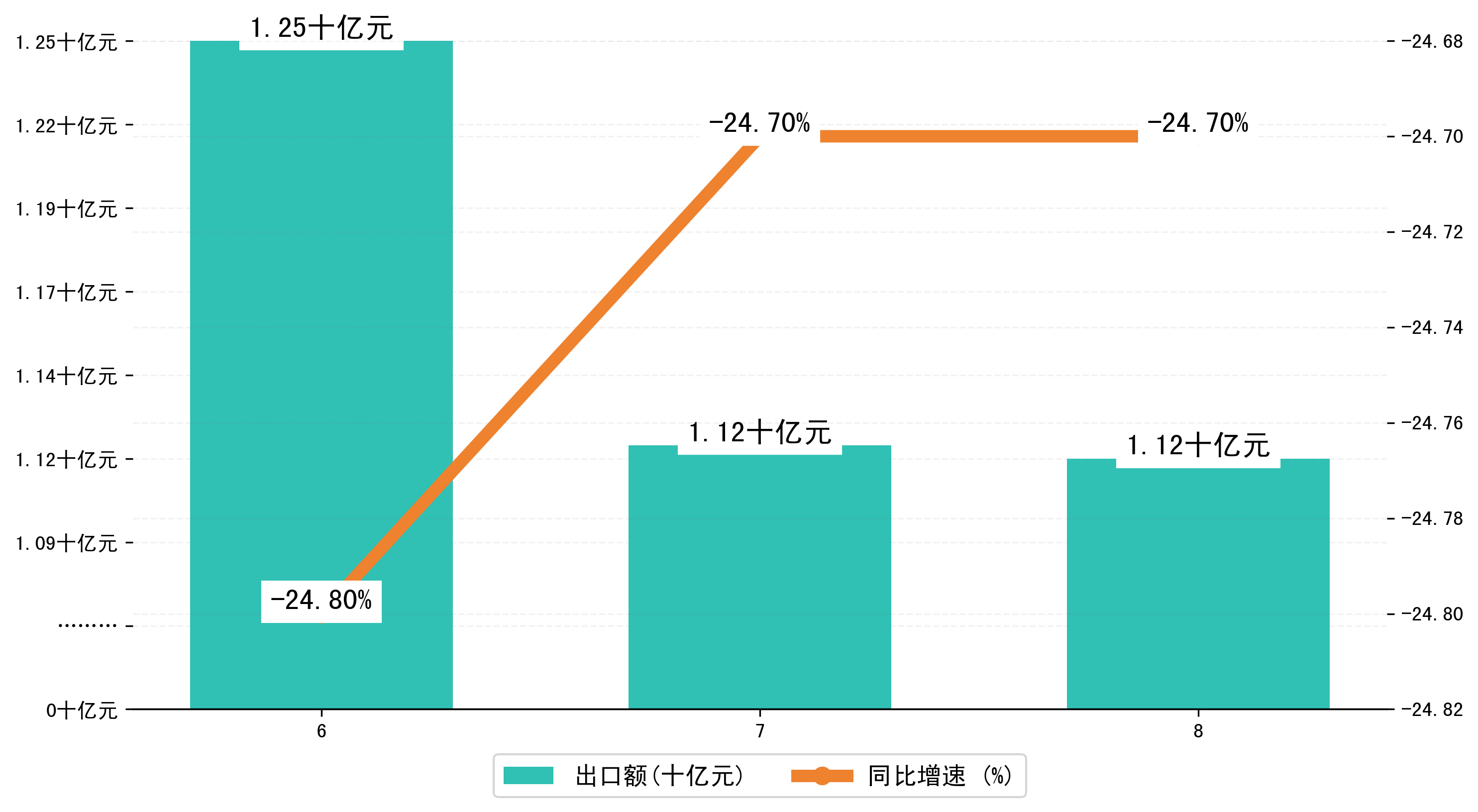 以人民币计,2024年8月郴州市出口额为11,1507.0656万元,相比上月减少了416.883万元;相比上年同期减少了3,7590.3063万元,同比减少了-24.70%。
