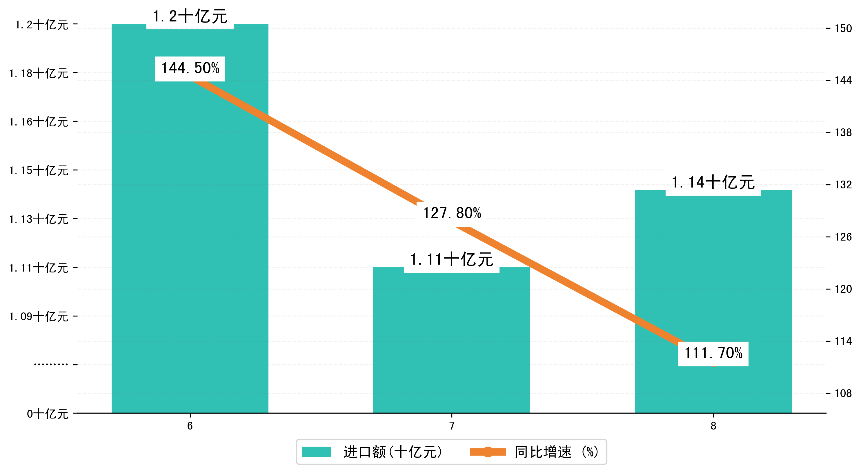 以人民币计,2024年1-8月郴州市进口额为183,6729.4937万元,相比上年同期增加了96,5014.1986万元,同比增加了111.70%。