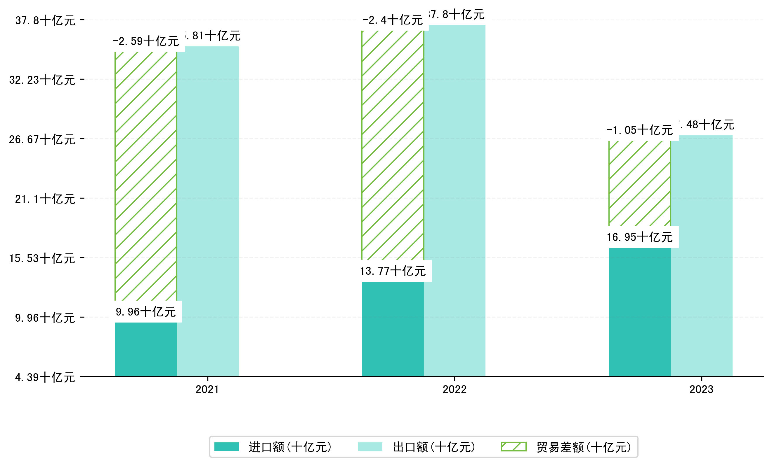 以人民币计,2023年1-12月郴州市贸易差额为105,2986,2461万元(贸易顺差),相比上年同期减少了135,0228,4001万元,同比减少-56.18%。