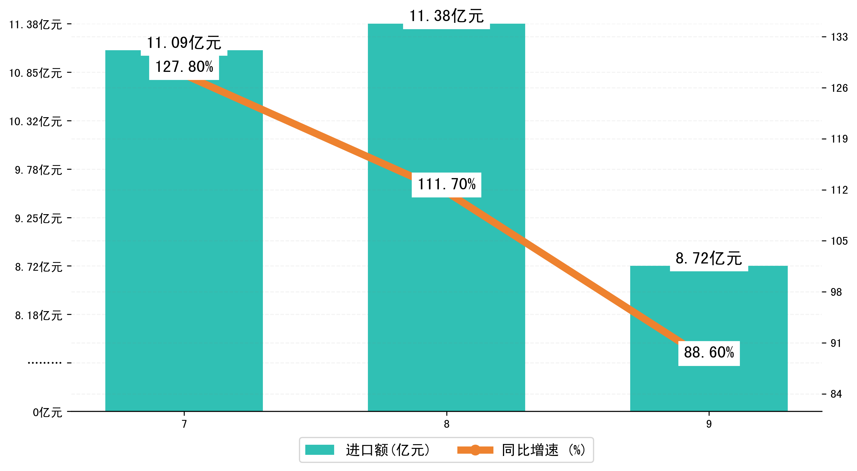以人民币计,2024年9月郴州市进口额为8,7173.9776万元,相比上月减少了2,6669.7146万元;相比上年同期减少了6,8186.8482万元,同比增加了88.60%。