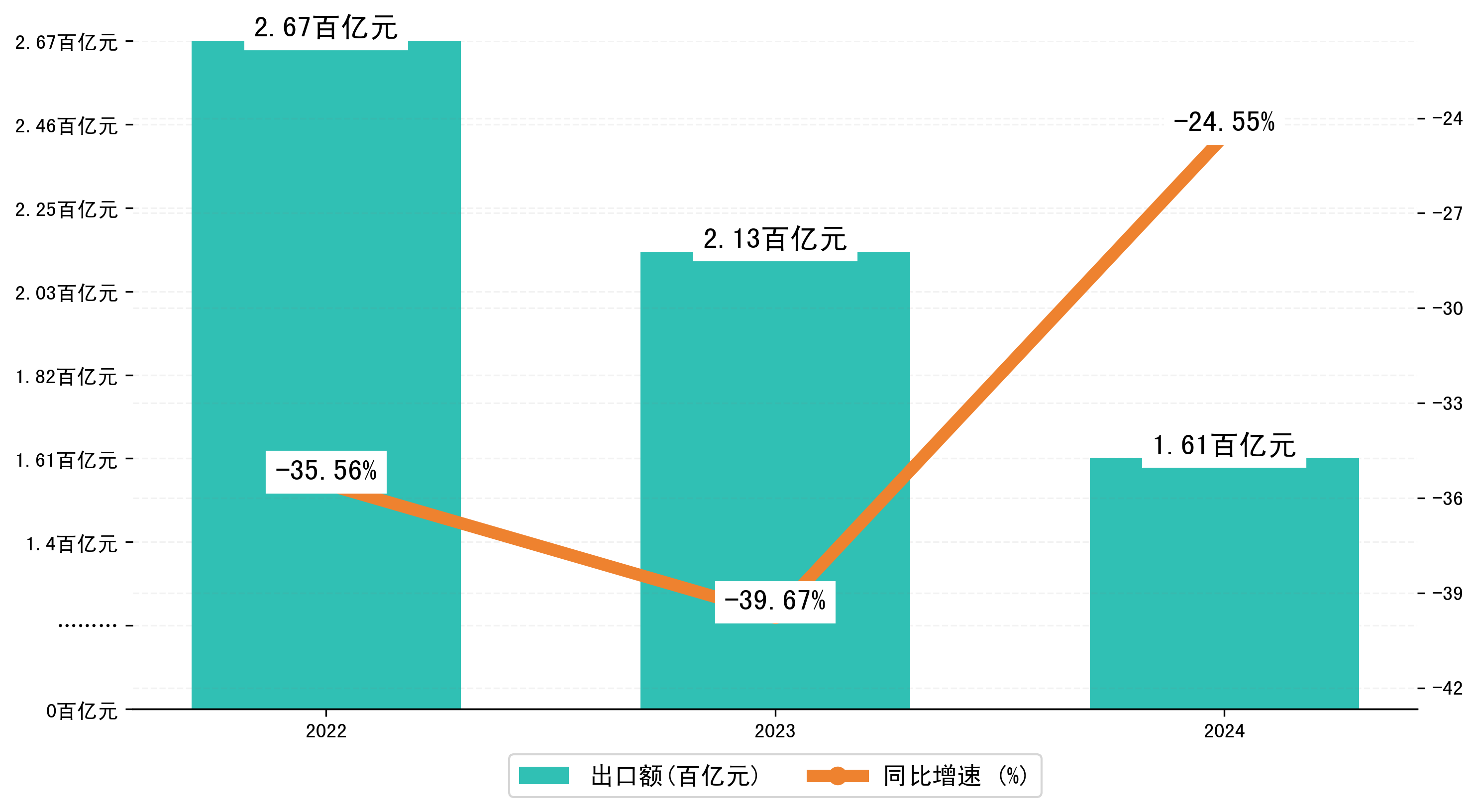 以人民币计,2024年1-9月郴州市出口额为161,0101.519万元,相比上年同期减少了52,3886.0101万元,同比减少了-24.00%。