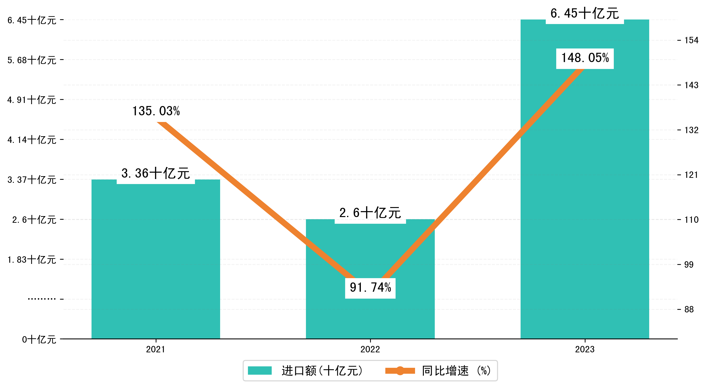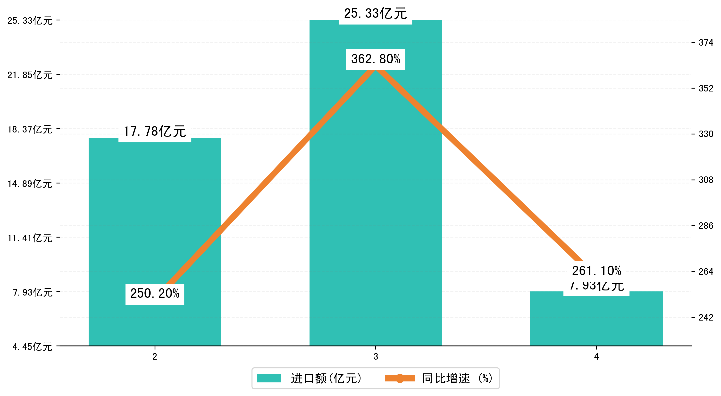 以人民币计,2023年1-4月郴州市进口额为64,5089.2135万元,相比上年同期增加了38,5025.4561万元,同比增加了261.10%。