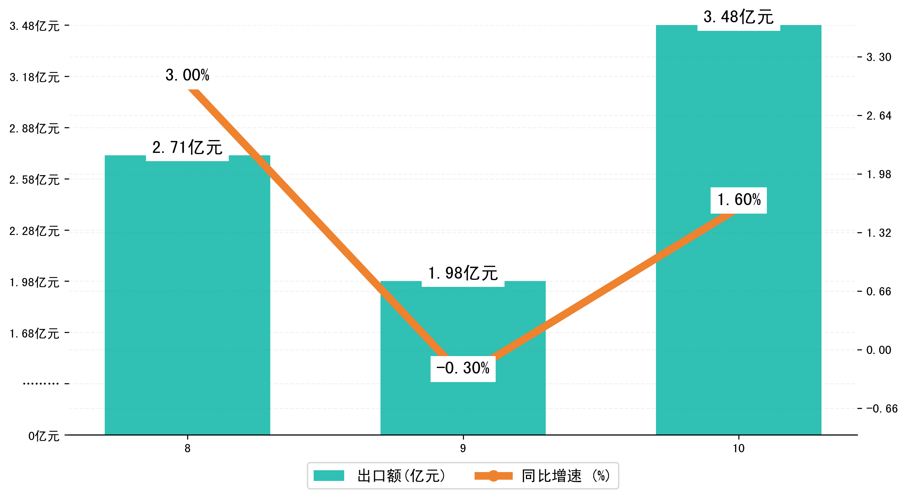 以人民币计,2024年1-10月池州市出口额为29,6700.0181万元,相比上年同期增加了4750.1229万元,同比增加了1.60%。