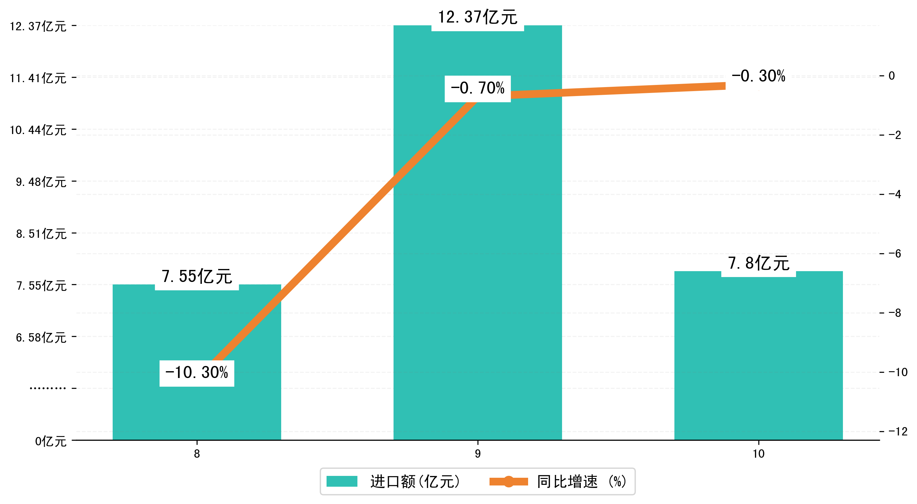 以人民币计,2024年1-10月池州市进口额为85,5063.6753万元,相比上年同期减少了3110.7761万元,同比减少了-0.30%。