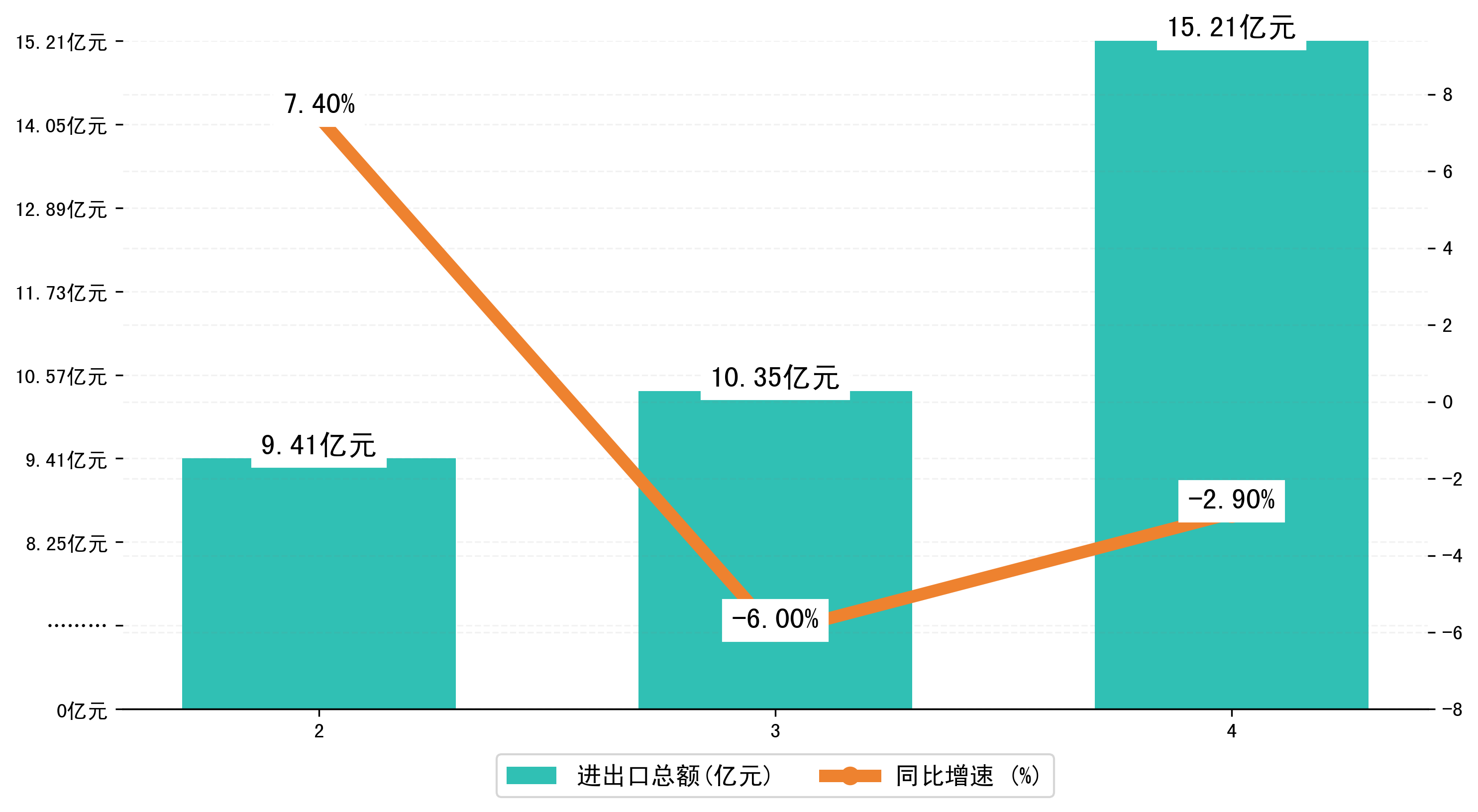 以人民币计,2024年1-4月池州市进出口总额为45,7542.5758万元,相比上年同期减少了1,5412.7346万元,同比减少了-2.90%。
