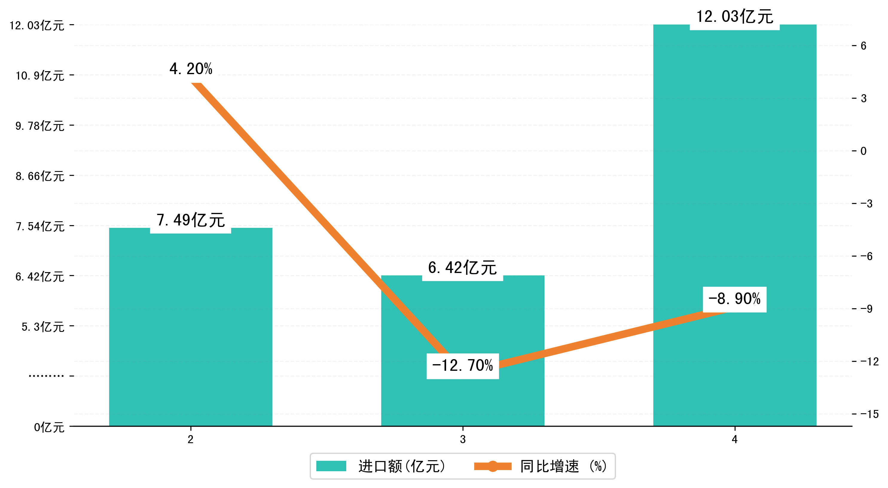 以人民币计,2024年1-4月池州市进口额为33,2116.0205万元,相比上年同期减少了3,4428.4666万元,同比减少了-8.90%。