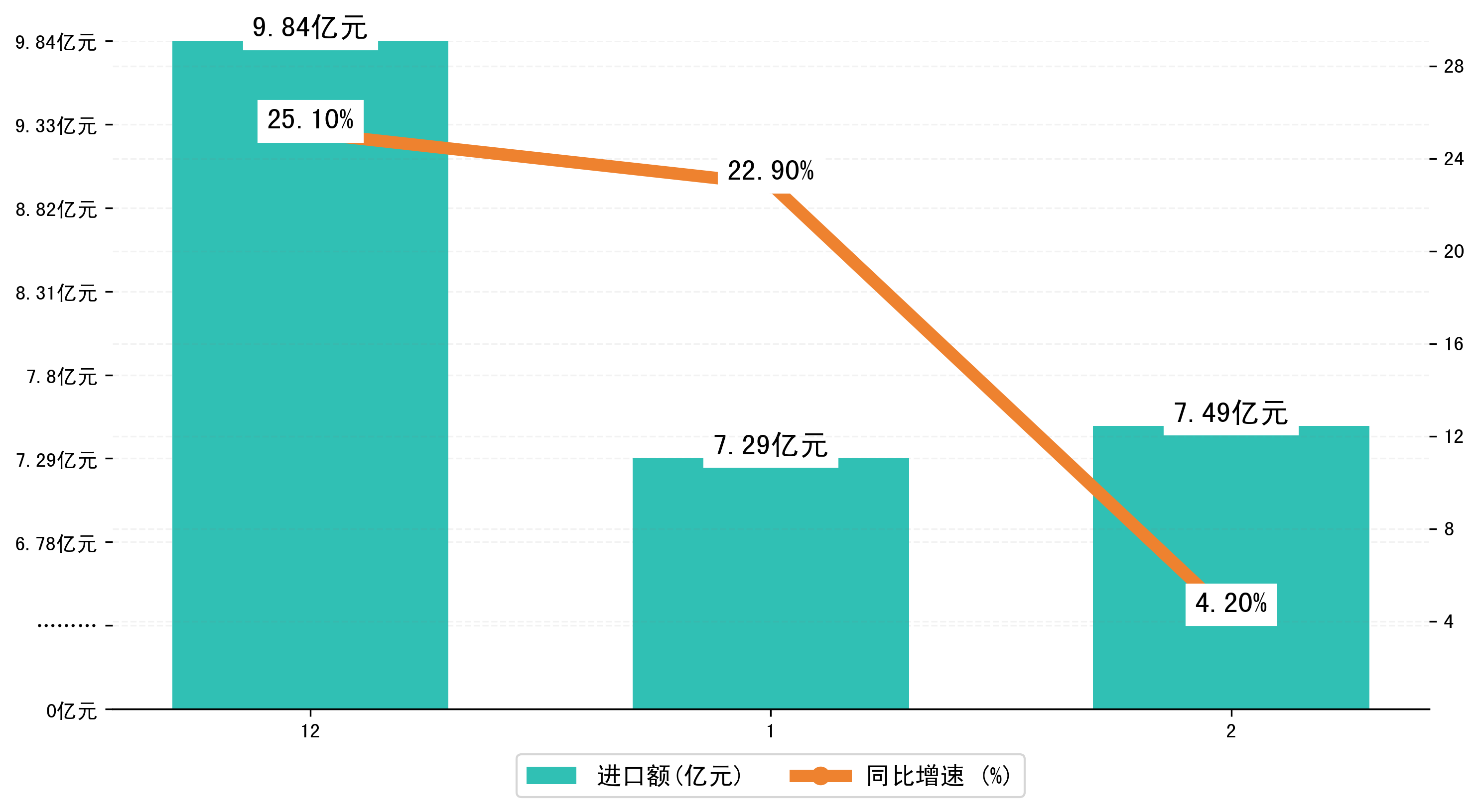 以人民币计,2024年2月池州市进口额为7,4859.9595万元,相比上月增加了1984.8275万元;相比上年同期减少了8217.7126万元,同比增加了4.20%。