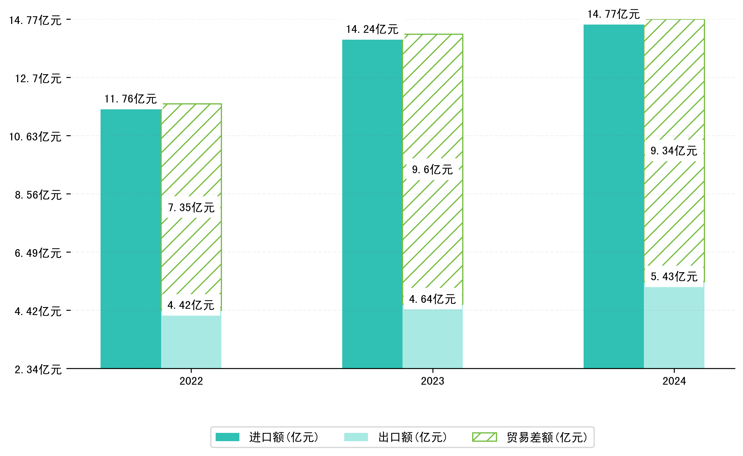 以人民币计,2024年1-2月池州市贸易差额为9,3410,8624万元(贸易逆差),相比上年同期增加了2587,3134万元,同比增加-2.7%。