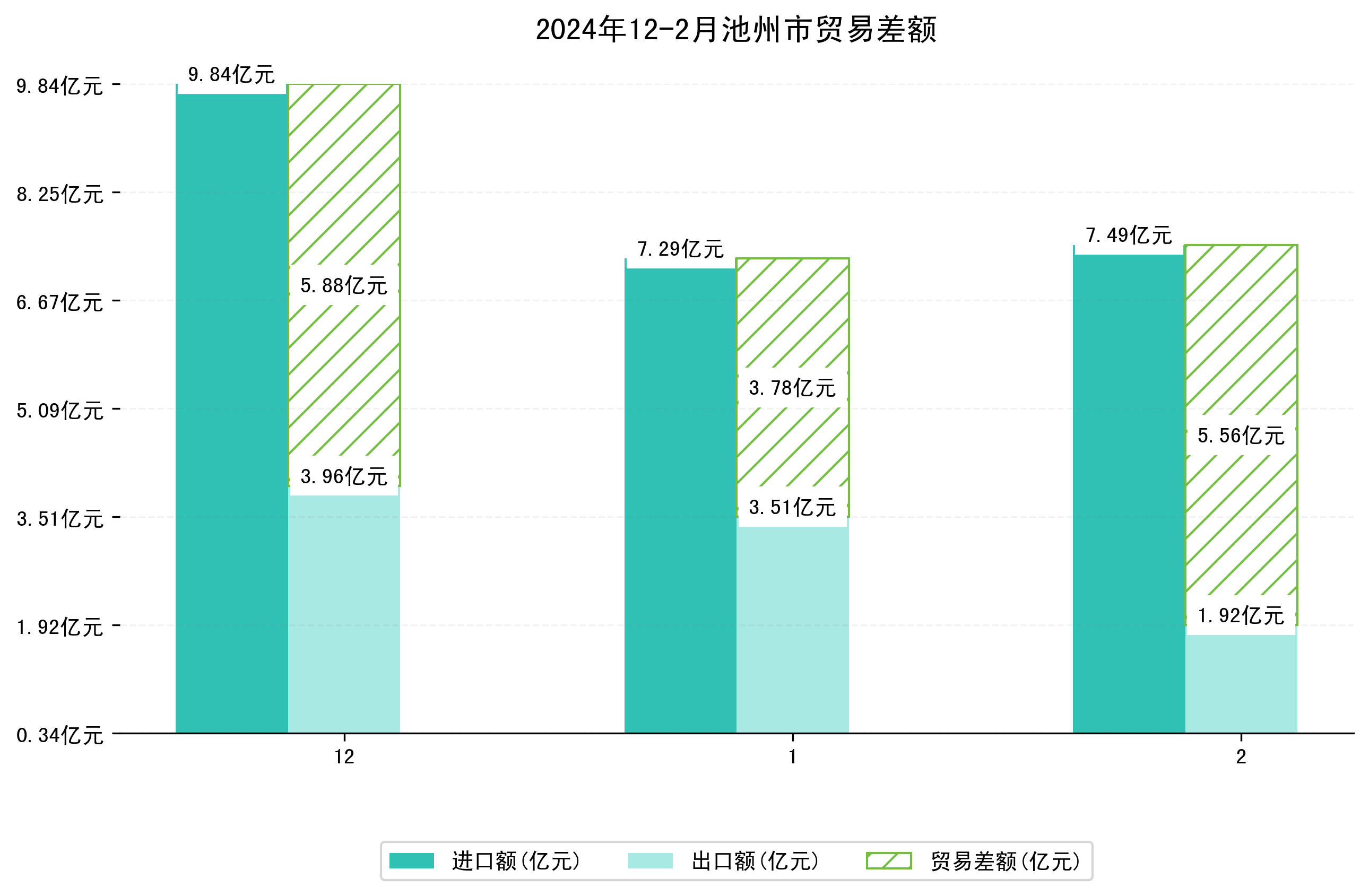 以美元计,2024年1-2月池州市贸易差额为1,3121,0272万美元(贸易逆差),相比上年同期增加了886,0339万美元,同比增加-6.33%。