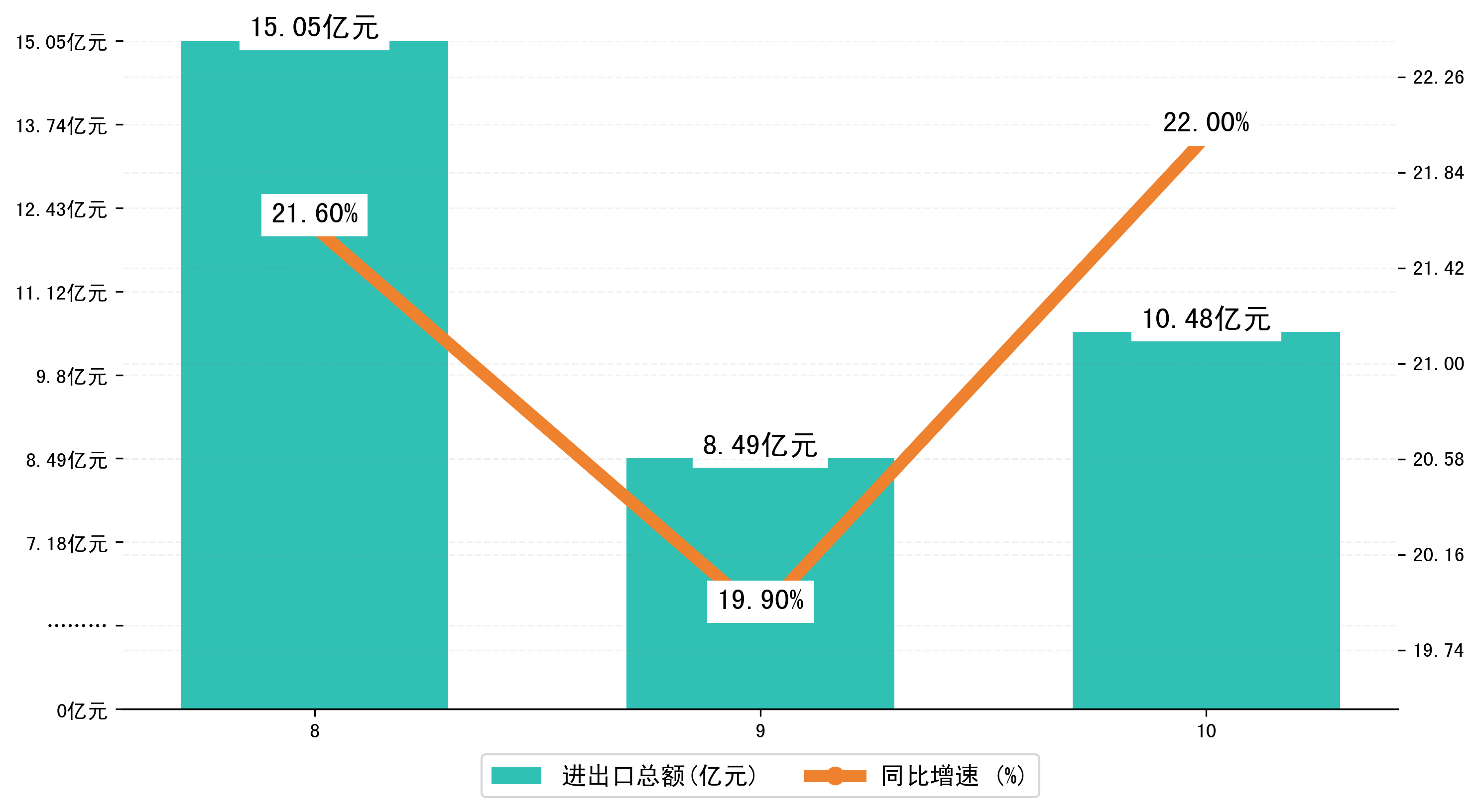 以人民币计,2023年1-10月池州市进出口总额为115,0124.3466万元,相比上年同期增加了19,9478.1628万元,同比增加了22.00%。