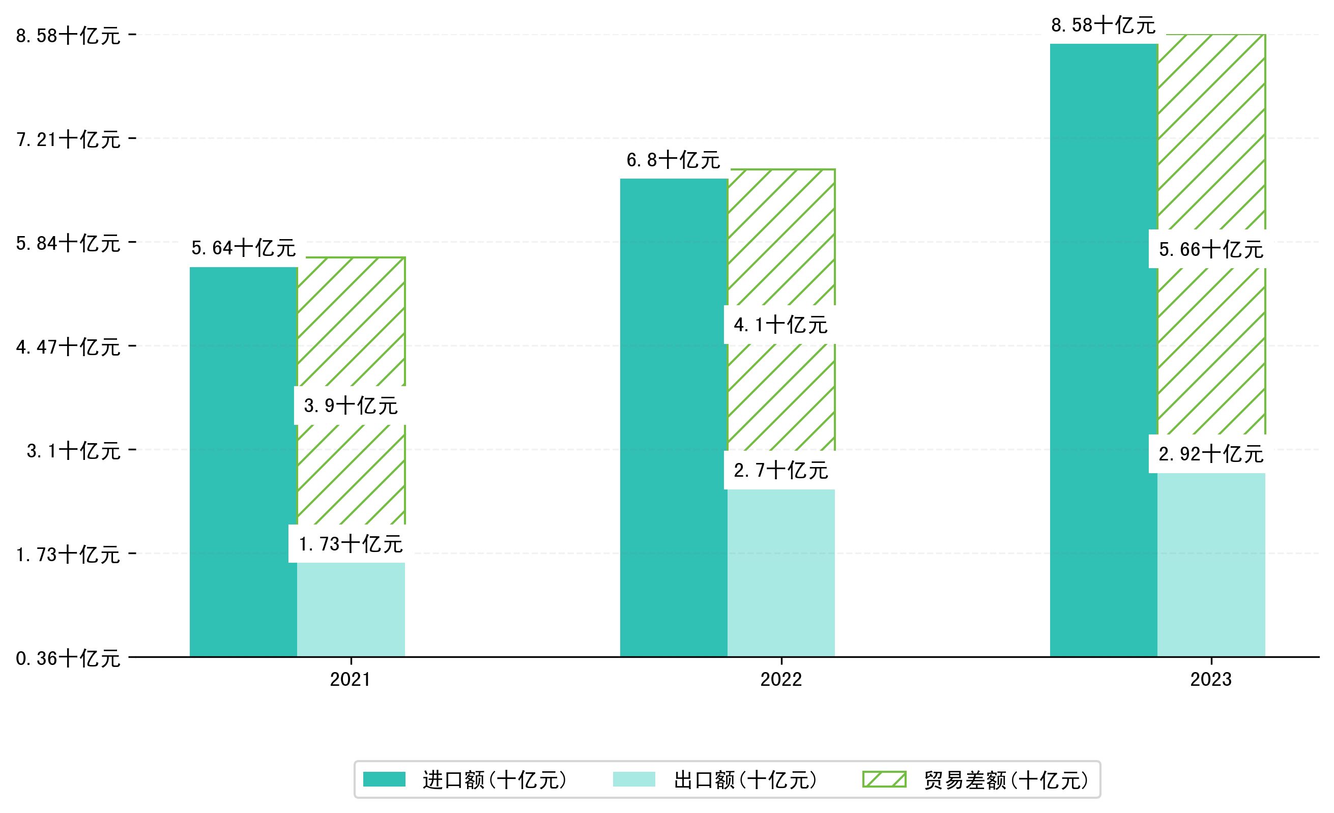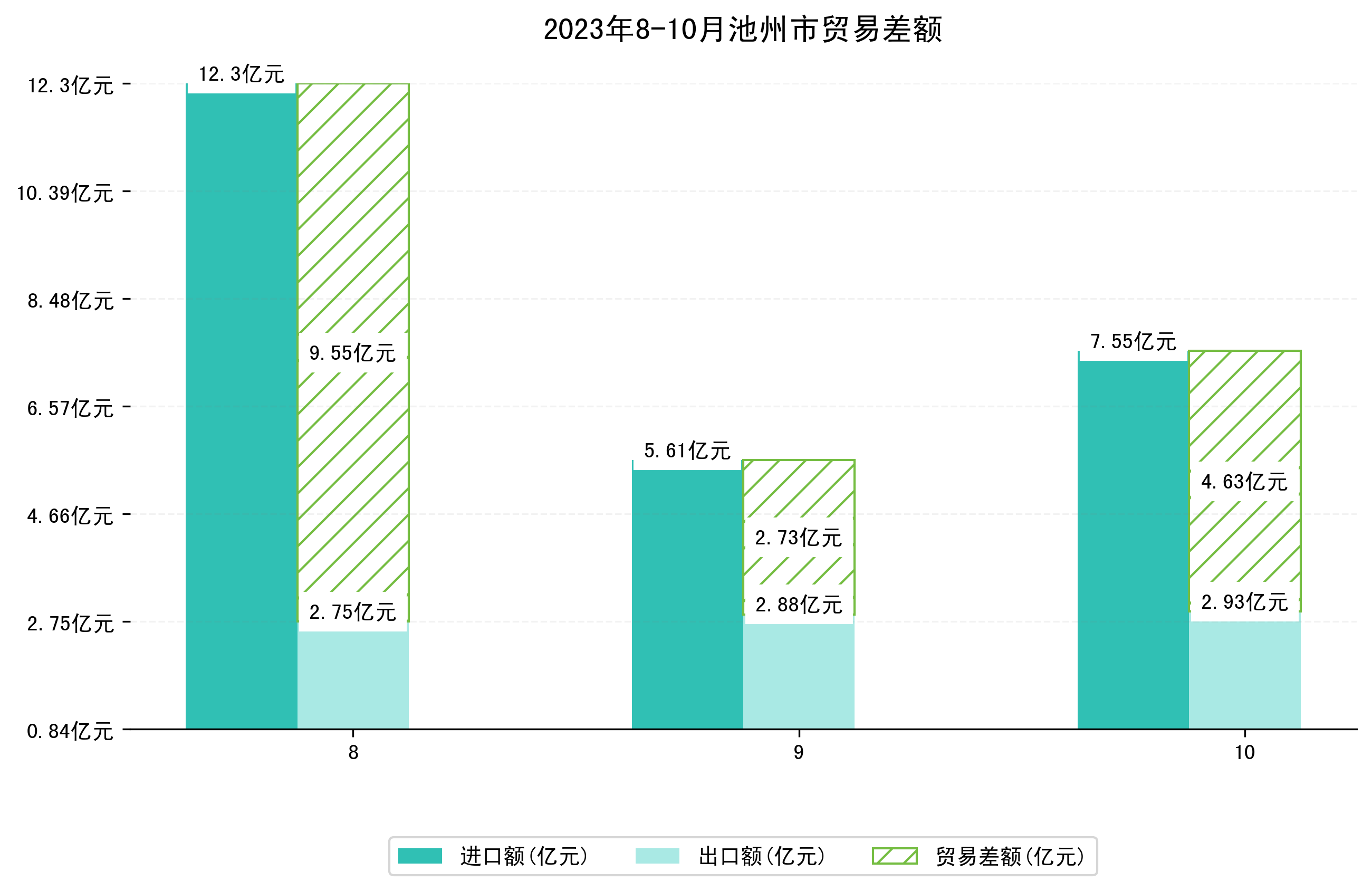 以美元计,2023年1-10月池州市贸易差额为8,1053,9013万美元(贸易逆差),相比上年同期减少了1,8381,9598万美元,同比减少29.33%。