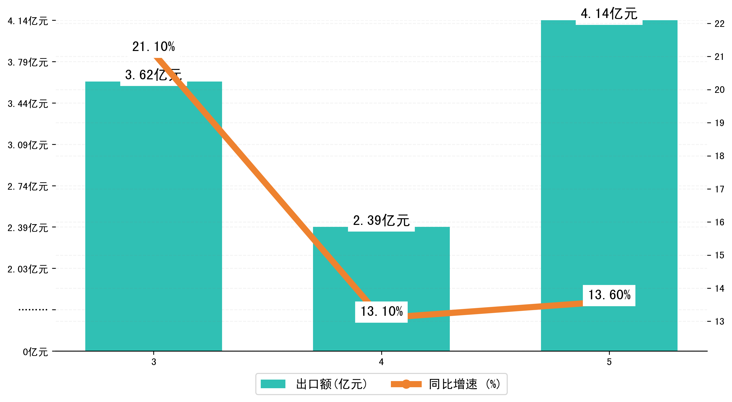 以人民币计,2023年5月池州市出口额为4,1382.9744万元,相比上月增加了1,7531.5302万元;相比上年同期增加了5446.5782万元,同比增加了13.60%。