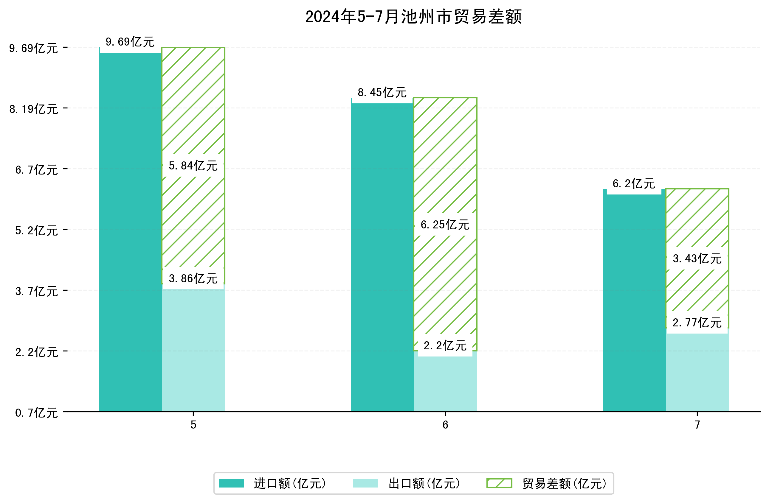 以人民币计,2024年7月池州市贸易差额为3,4320,9269万元(贸易逆差),相比上月增加了2,8160,6654万元,即3974,1193万美元;相比上年同期增加了2,1570,2319万元,同比增加-38.59%。