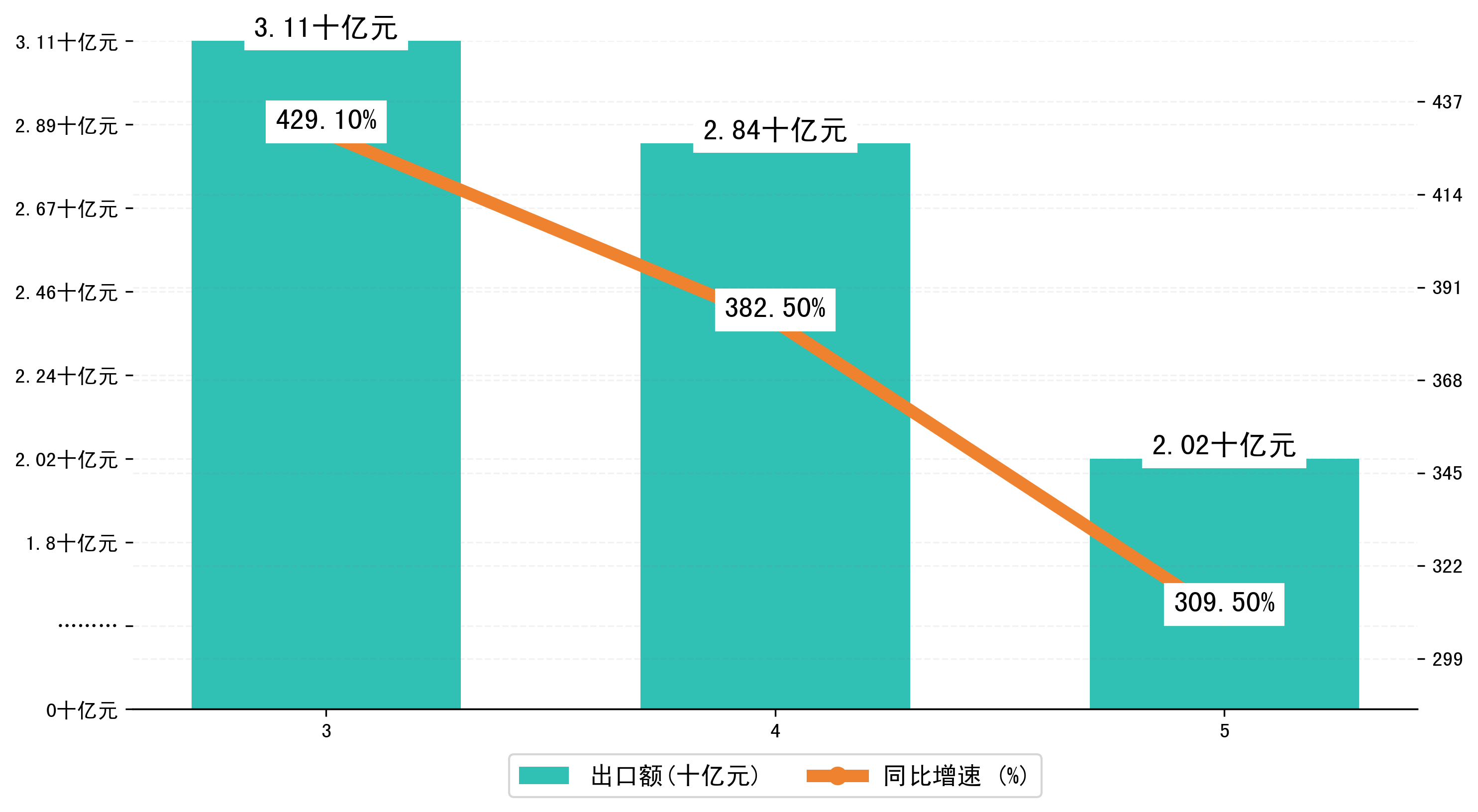 以美元计,2025年1-5月防城港市出口额为26,8635.4434万美元,相比上年同期增加了20,2239.2555万美元,同比增加304.80%。