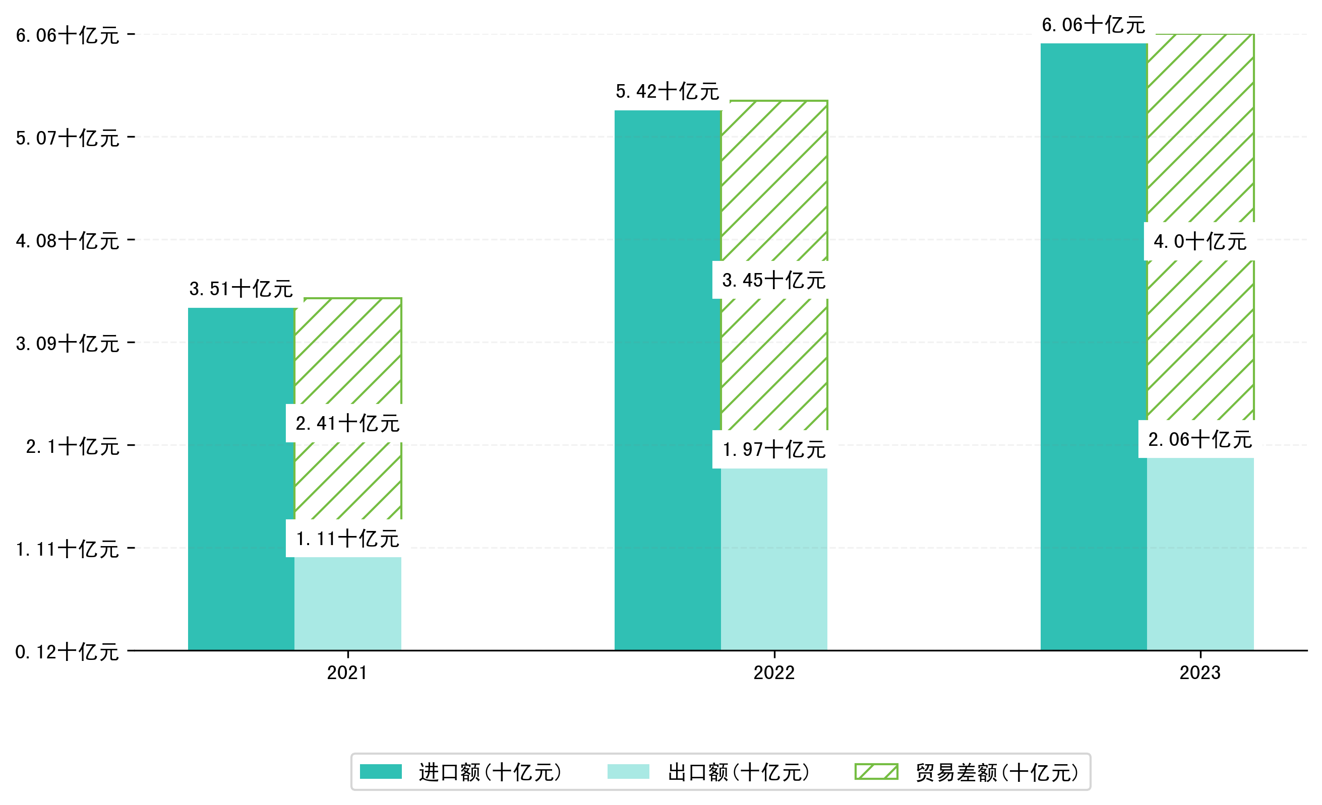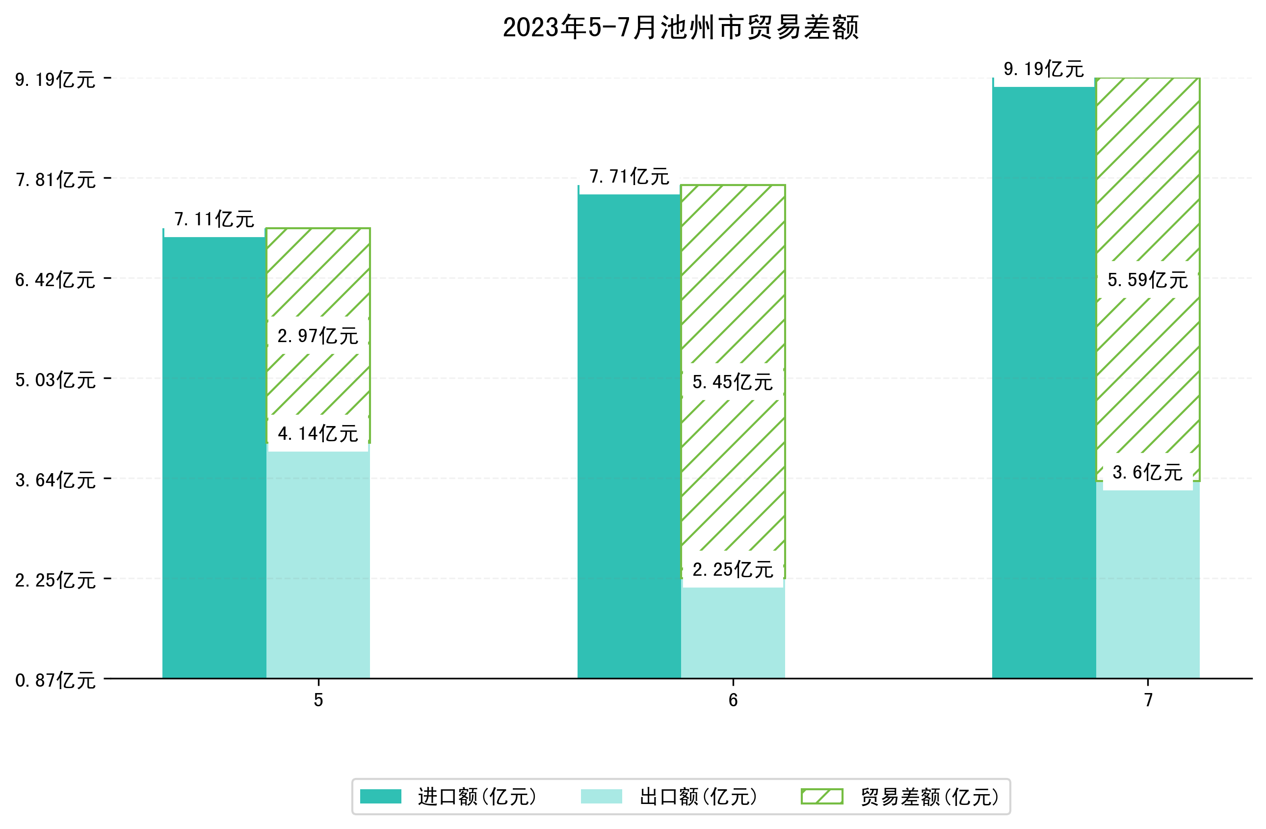 以美元计,2023年1-7月池州市贸易差额为5,7864,7555万美元(贸易逆差),相比上年同期减少了4607,5871万美元,同比减少8.65%。