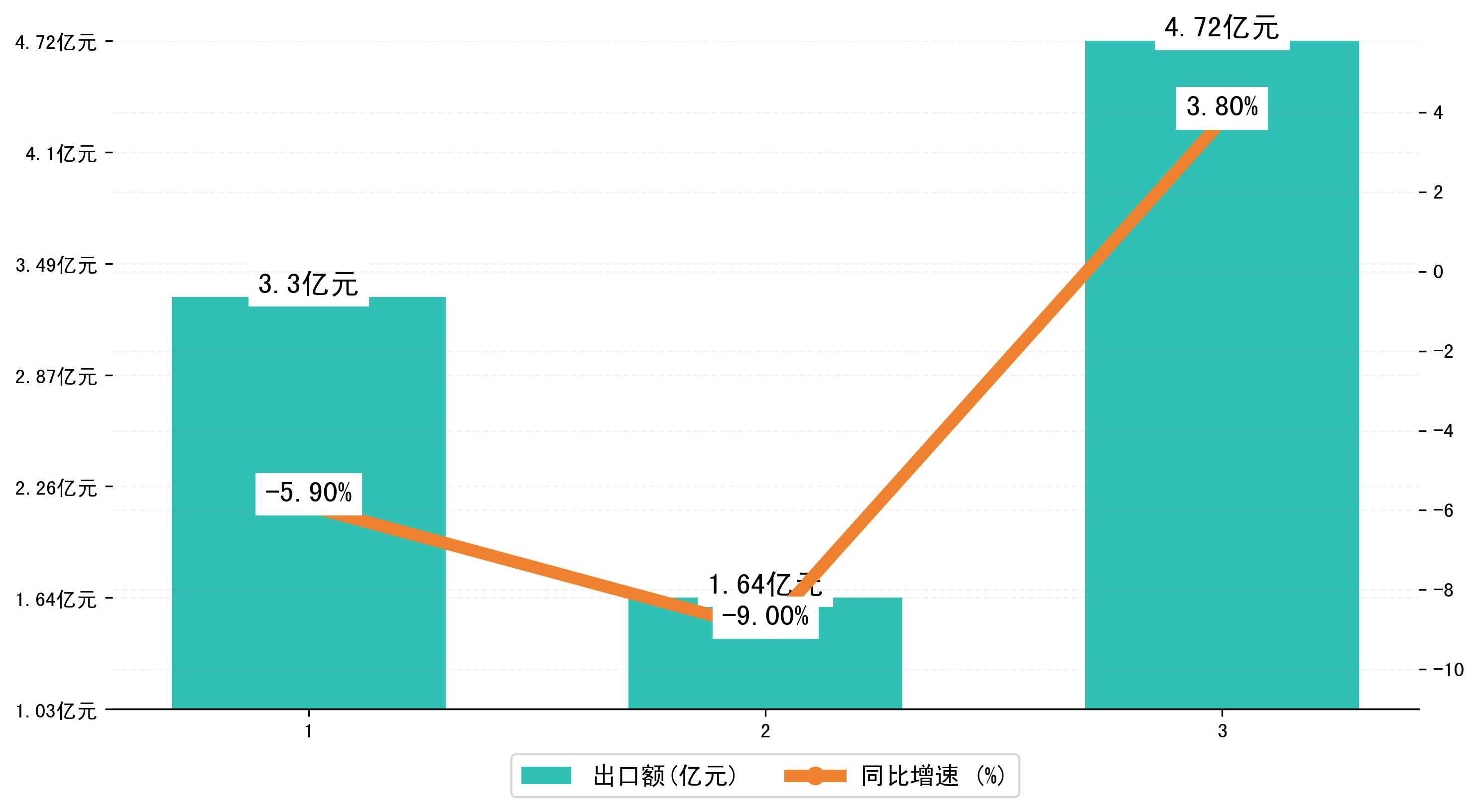 以美元计,2025年1-3月池州市出口额为1,3457.9604万美元,相比上年同期增加了284.3248万美元,同比增加2.70%。