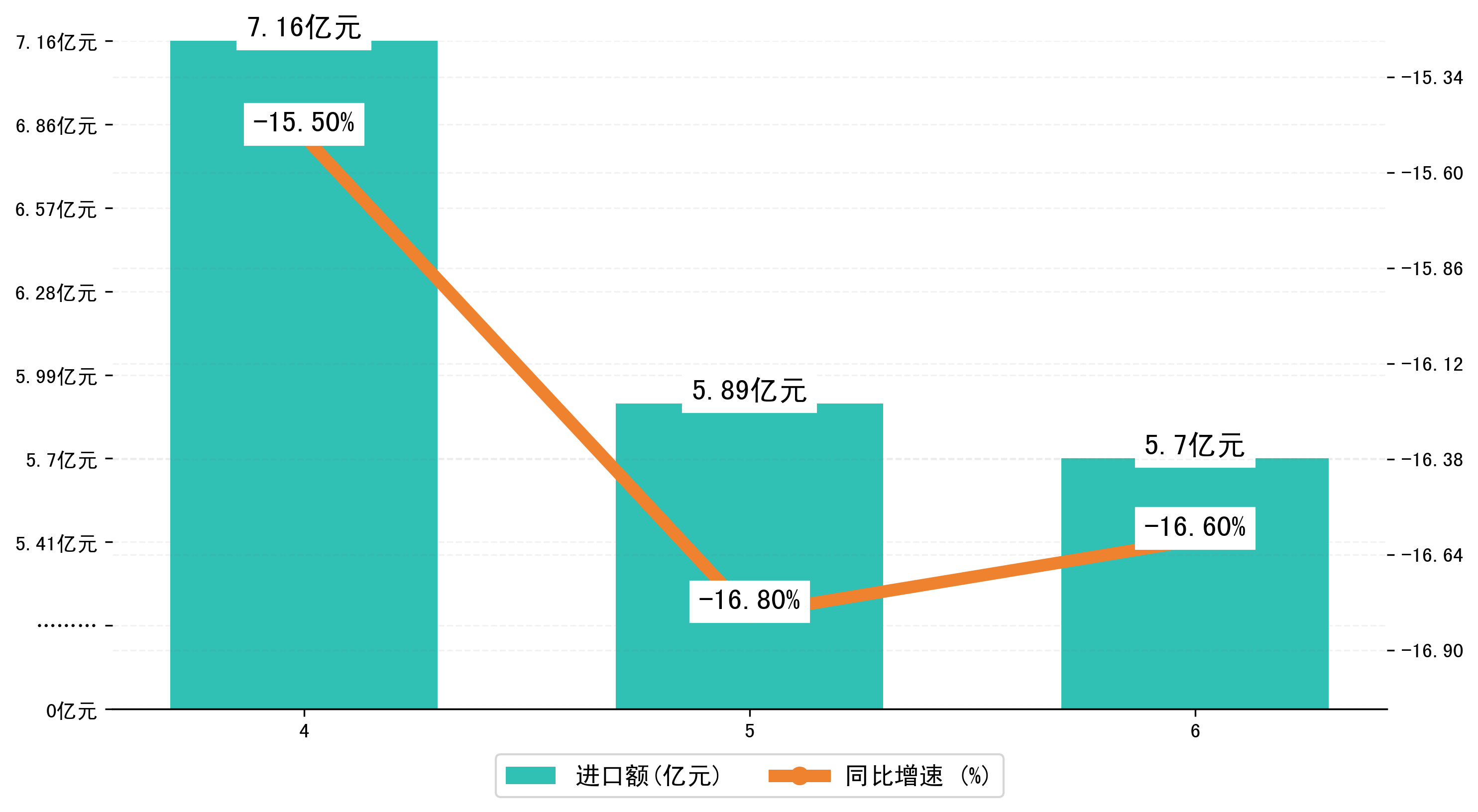 以美元计,2023年6月呼和浩特市进口额为8208.5552万美元,相比上月减少了362.0591万美元;相比上年同期减少了2016.2926万美元,同比减少-22.70%。