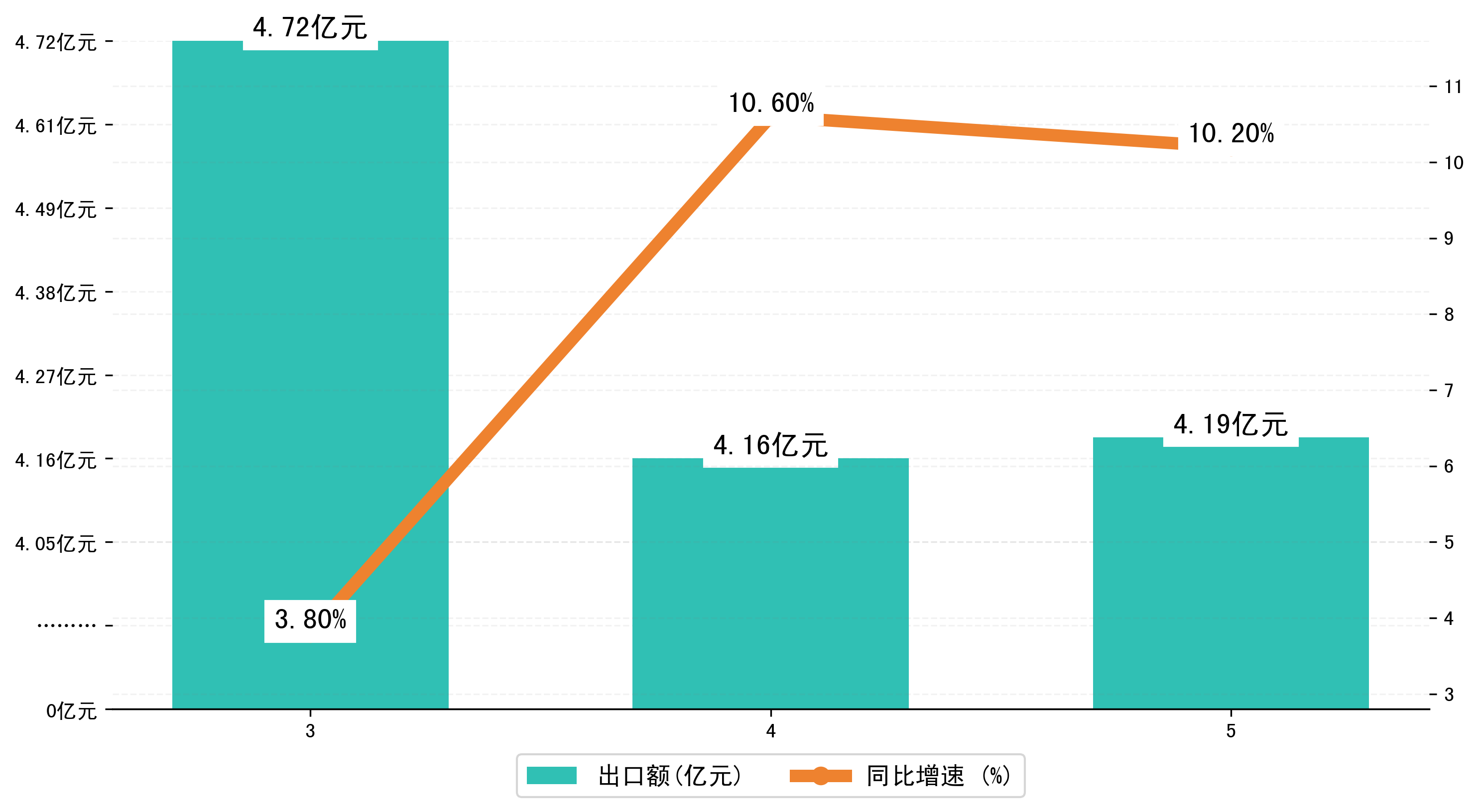 以美元计,2025年1-5月池州市出口额为2,5068.4879万美元,相比上年同期增加了1979.6037万美元,同比增加8.90%。