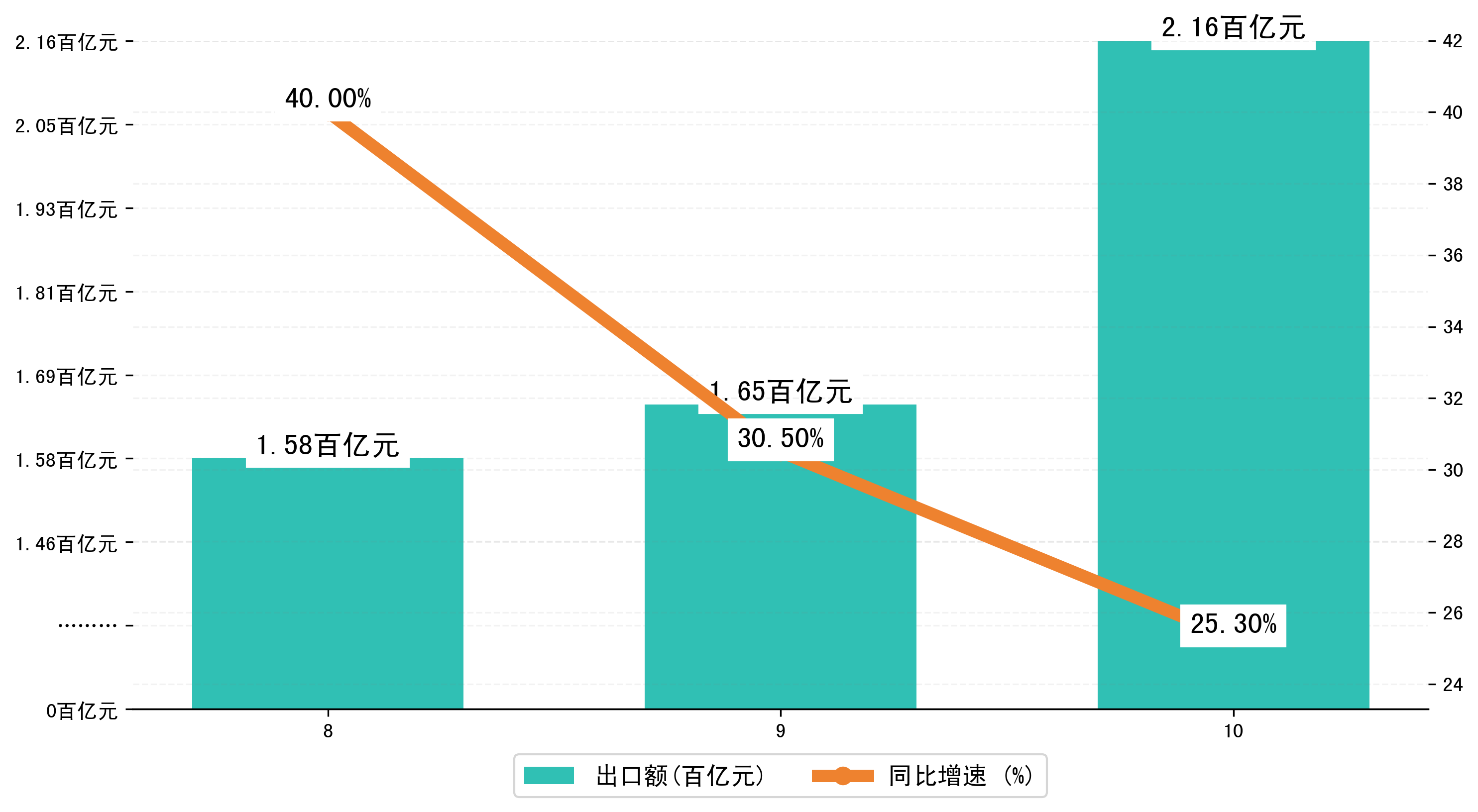 以人民币计,2024年10月崇左市出口额为216,4495.1877万元,相比上月增加了51,1501.5322万元;相比上年同期减少了8,2740.1998万元,同比增加了25.30%。