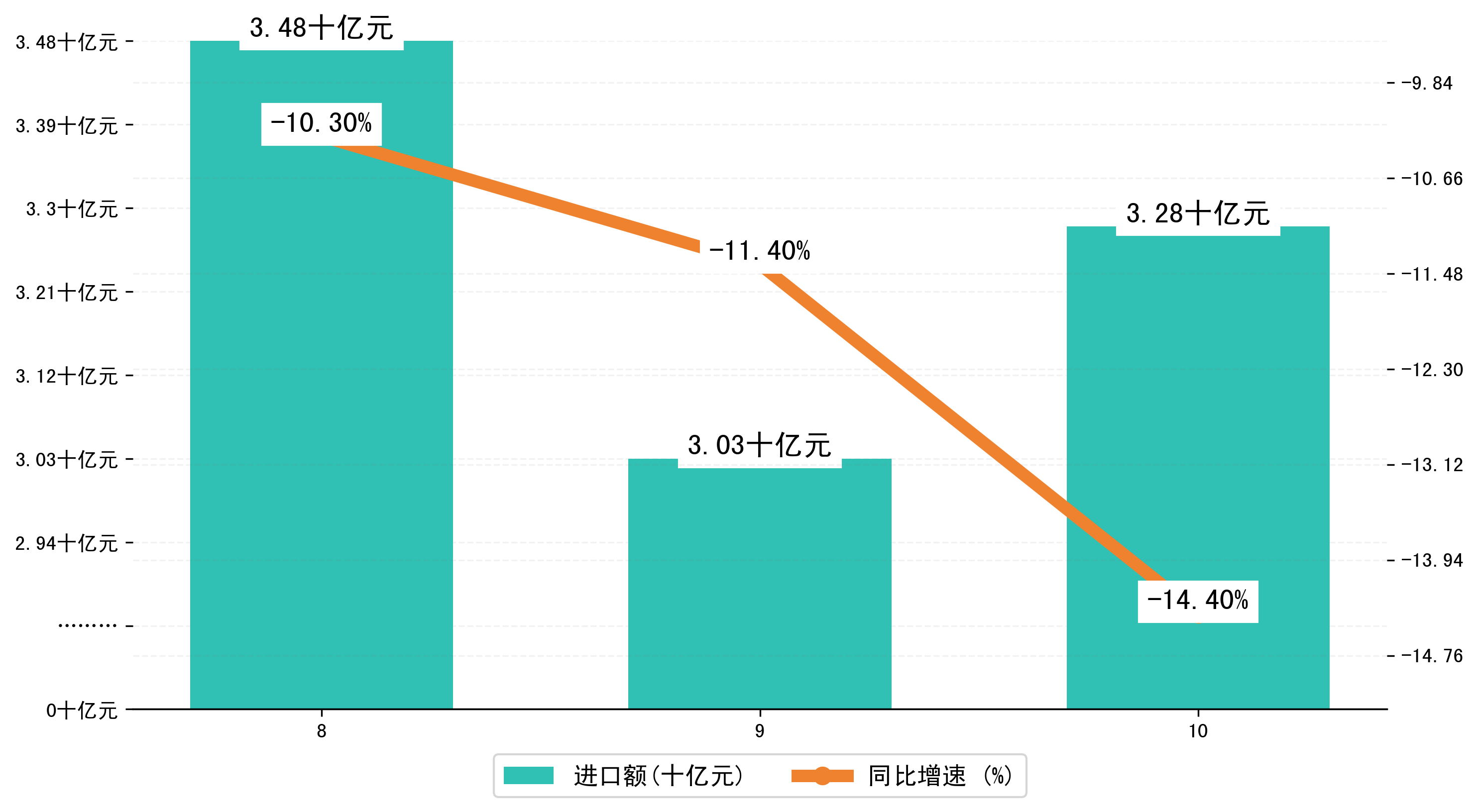 以人民币计,2024年1-10月崇左市进口额为361,2298.3397万元,相比上年同期减少了115,8446.3411万元,同比减少了-14.40%。