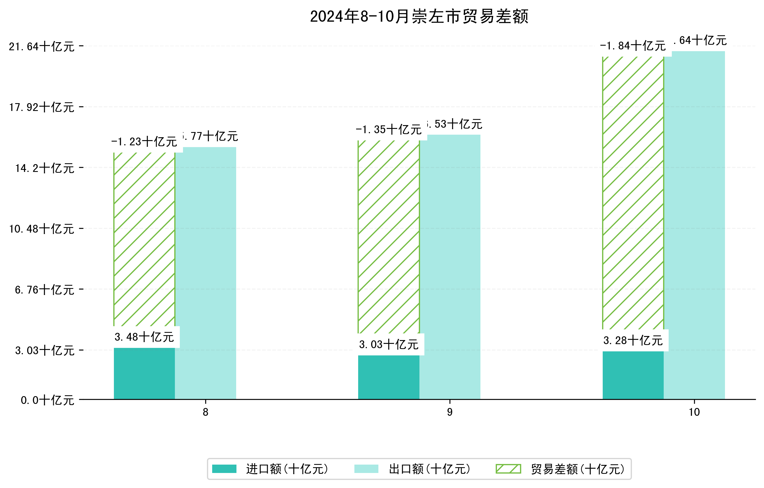 以美元计,2024年1-10月崇左市贸易差额为199,5753,3852万美元(贸易顺差),相比上年同期增加了58,4347,8733万美元,同比增加41.4%。