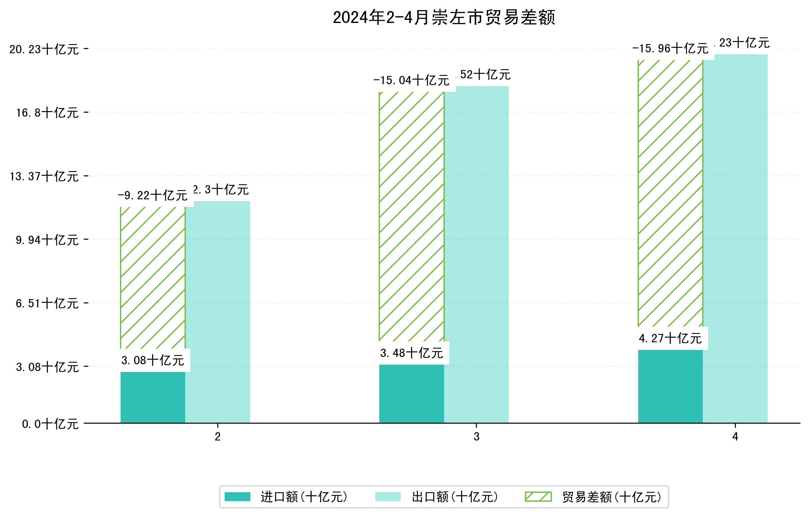 以美元计,2024年1-4月崇左市贸易差额为83,2207,5310万美元(贸易顺差),相比上年同期增加了27,1927,0357万美元,同比增加48.53%。