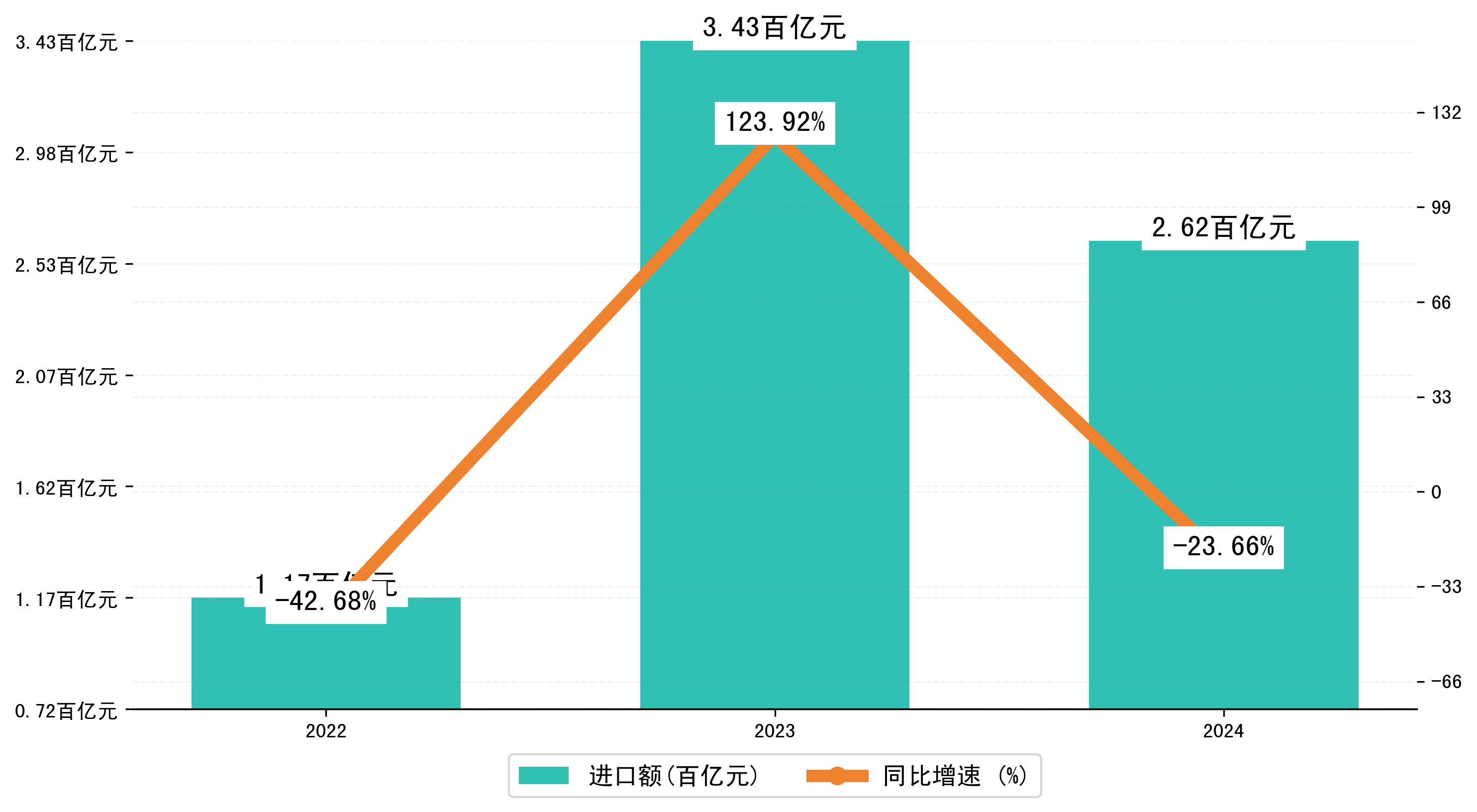 以人民币计,2024年1-7月崇左市进口额为261,9345.3624万元,相比上年同期减少了81,1696.5096万元,同比减少了-11.90%。