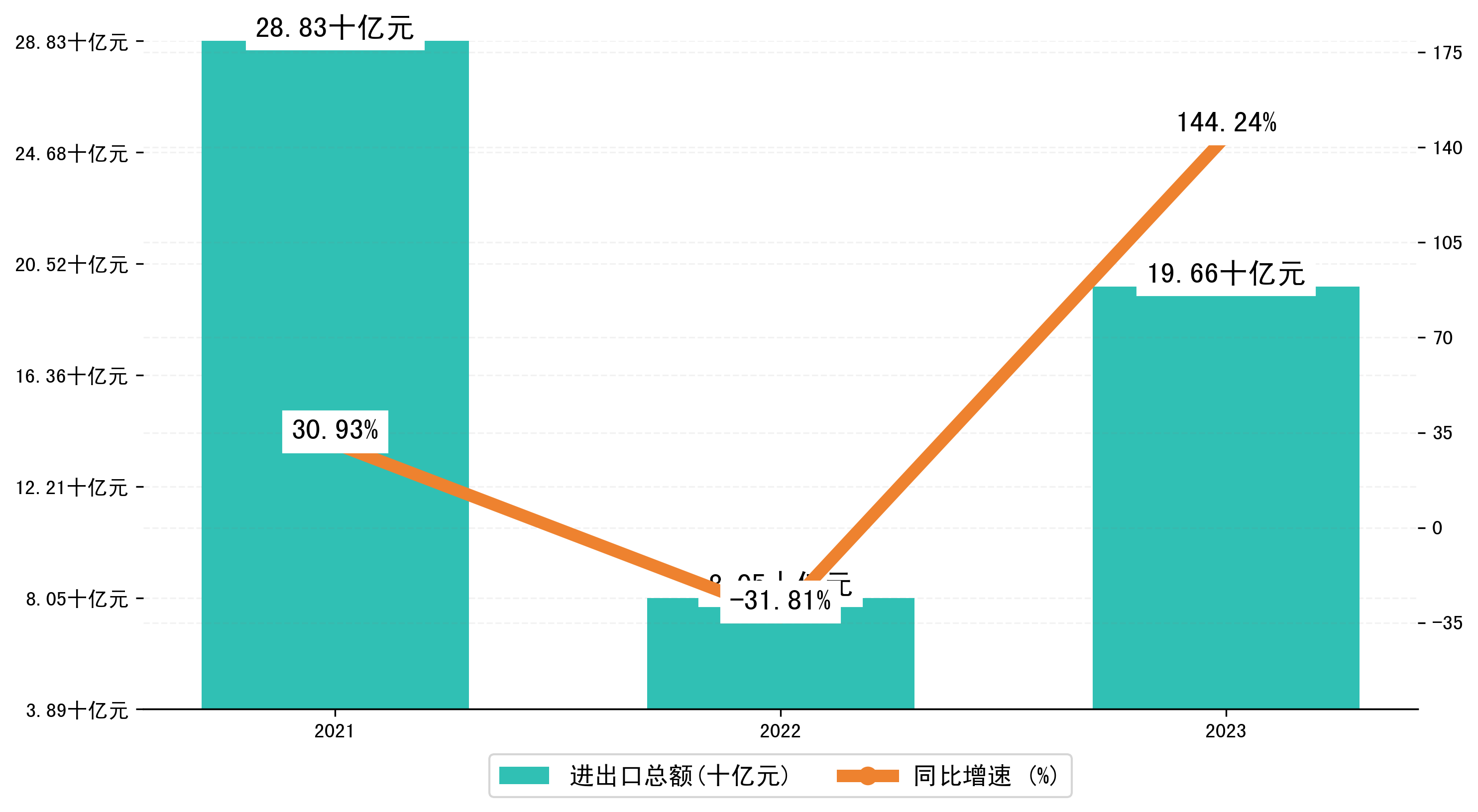 以美元计,2023年1-1月崇左市进口额为5,7226.132万美元,相比上年同期增加了2,4533.414万美元,同比增加74.70%。