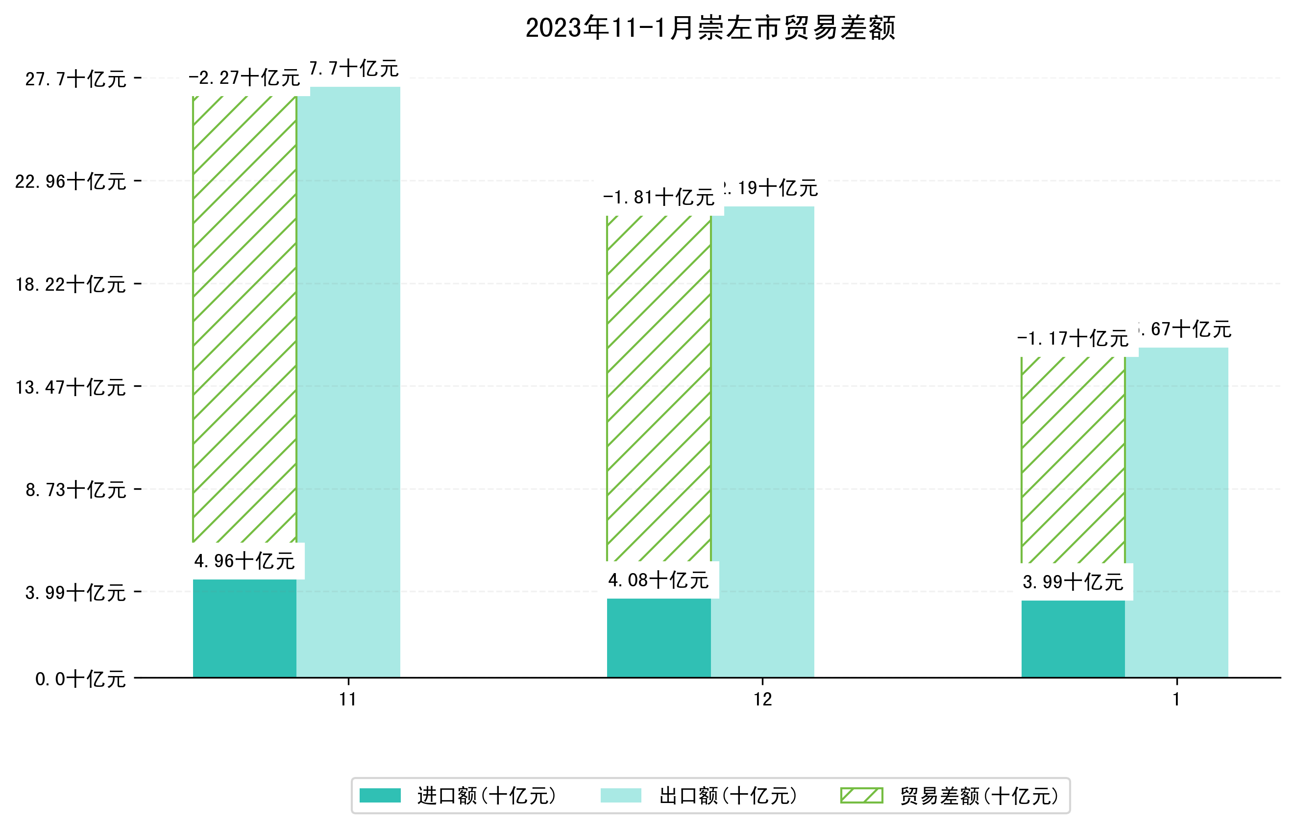 以美元计,2023年1-1月崇左市贸易差额为16,7429,8625万美元(贸易顺差),相比上年同期增加了10,6538,8221万美元,同比增加174.97%。