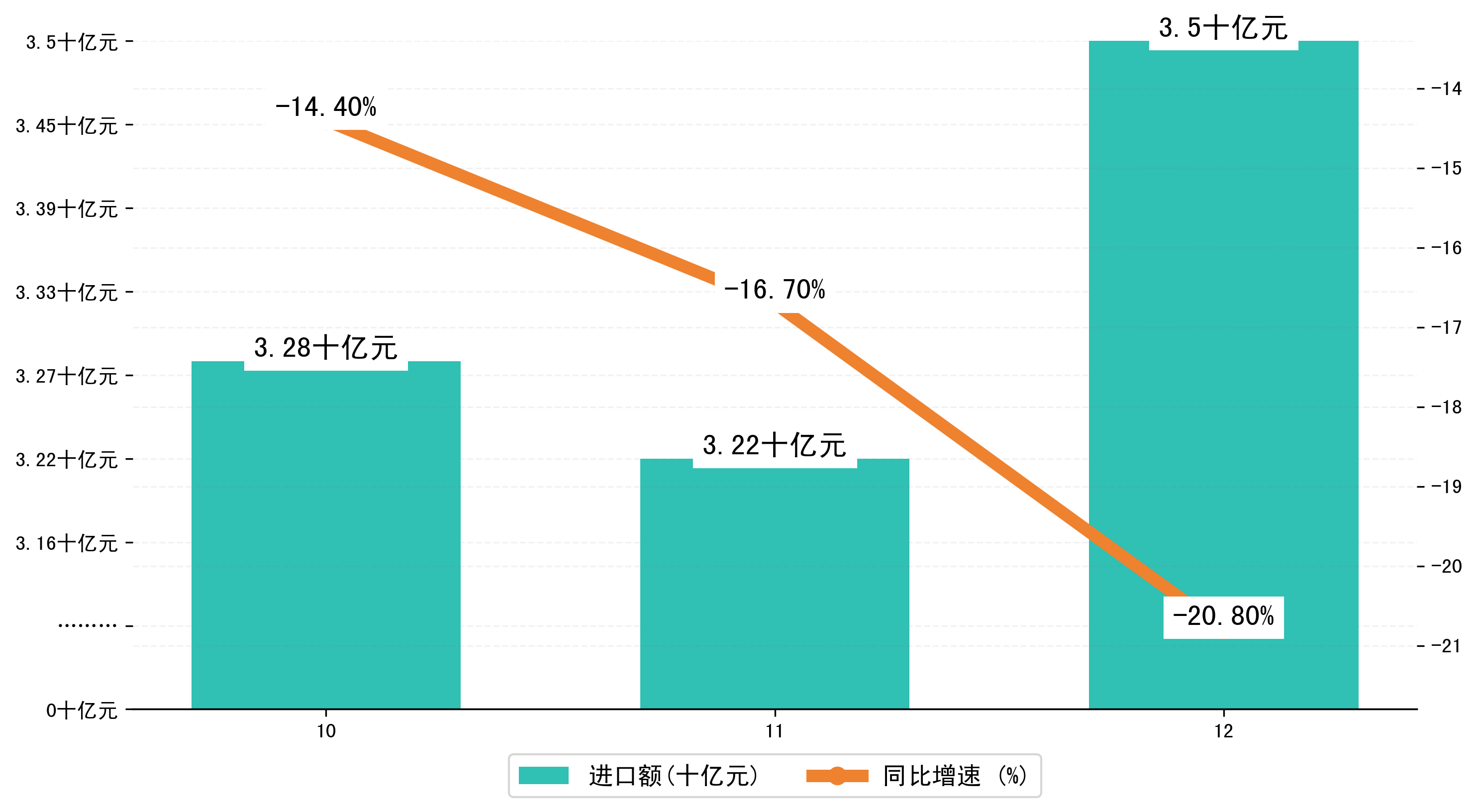 以人民币计,2024年12月崇左市进口额为35,0396.2504万元,相比上月增加了2,8803.1659万元;相比上年同期减少了30,4425.147万元,同比减少了-20.80%。